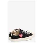 Black cotton low top sneaker from Comme des Garçons Play featuring a round toe, a white lace up front, a contrasting white toe cap, a red heart printed logo to the side and a thick white rubber sole. Chuck Taylor Red Heart sneakers