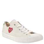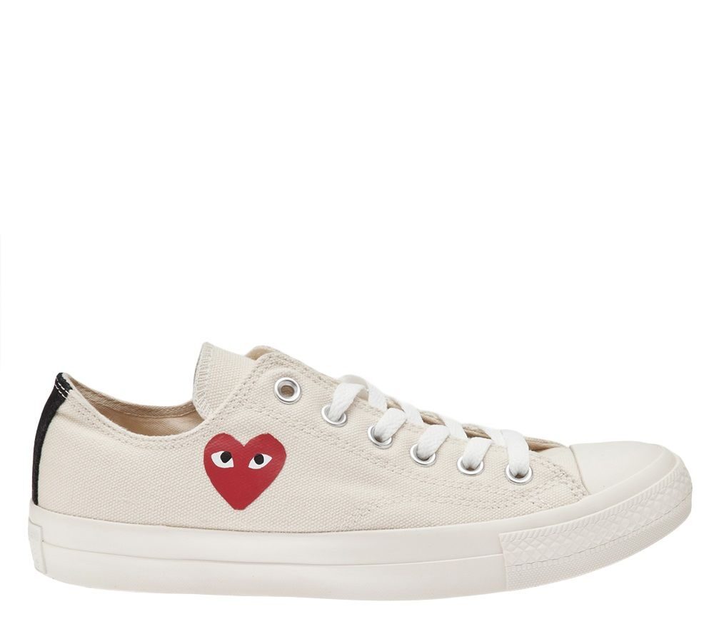 Lo sneaker in white from Converse Comme des Garçons Play. This canvas shoe features a cap toe, lace up detail, and flat rubber sole. Sold as women’s US sizing. Chuck Taylor low-top sneakers