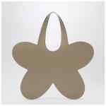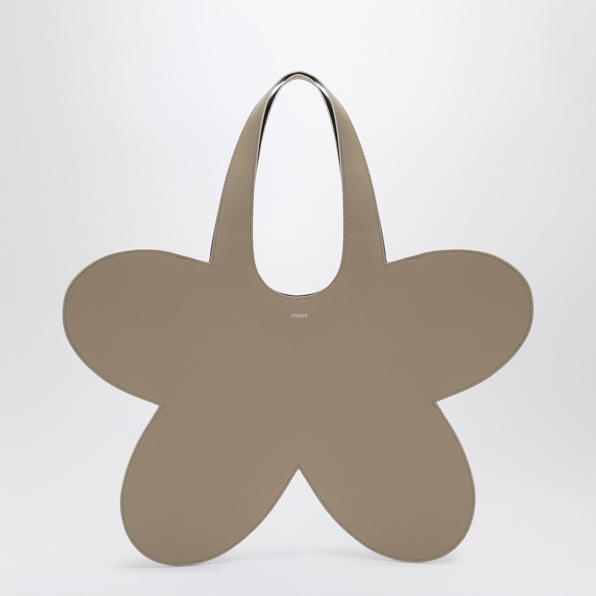 Biege leather Coperni bag featuring a flower design, two top handles, contrasting lettering logo and single compartment.