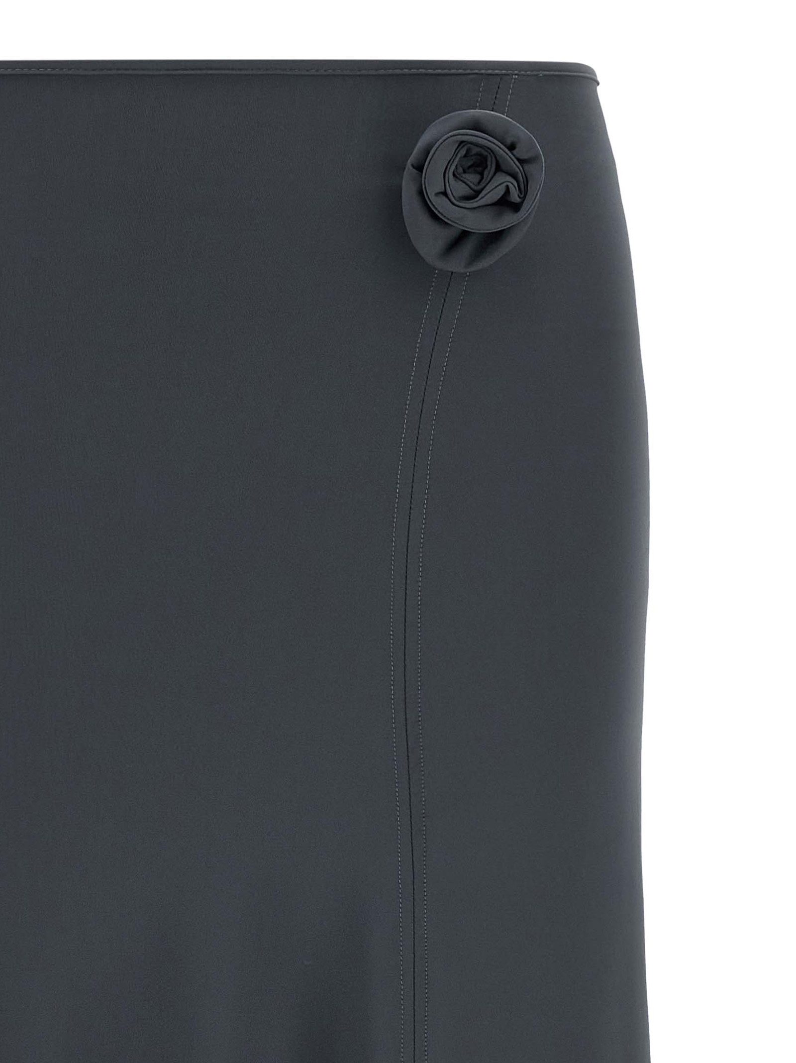 ‘Flower’ midi skirt in stretch technical fabric with flared silhouette, floral bow detail and front slits, asymmetrical hem.