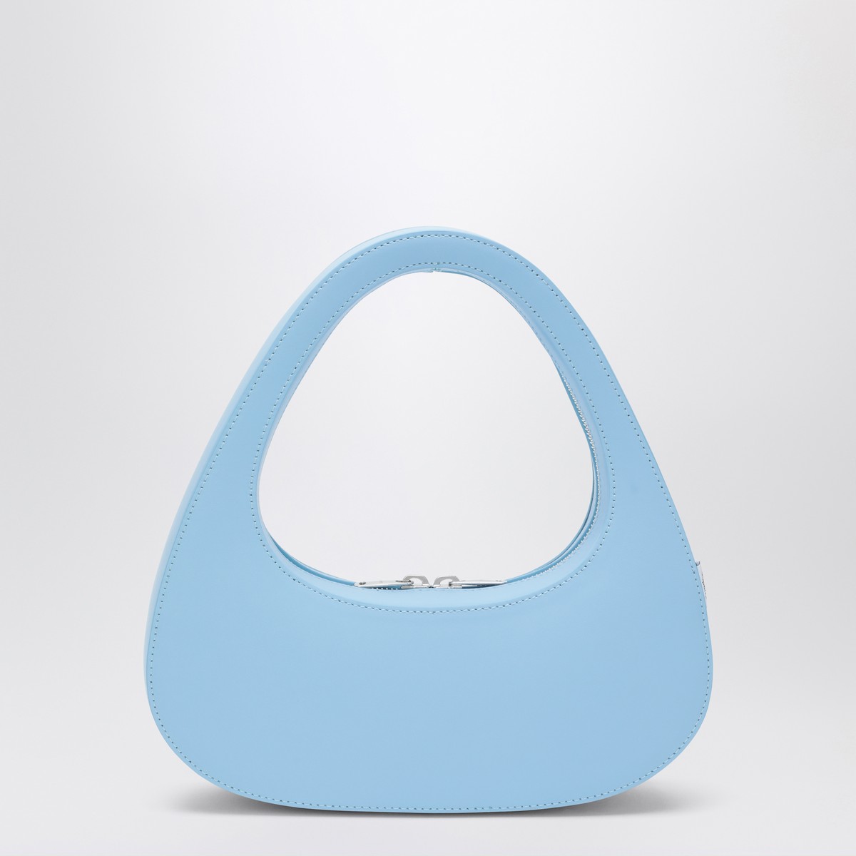 Leather micro bag from Coperni featuring a curved triangular design, a zip fastening, an external logo plaque, contrasting front lettering, a single compartment, a removable shoulder strap and silver-coloured metal hardware.