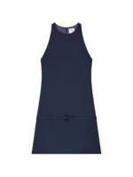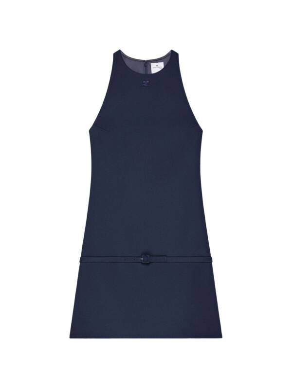 navy blue twill texture round neck sleeveless belted waist mini length A-line mini dress.