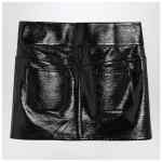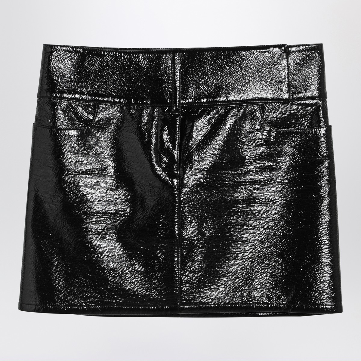Mini skirt by Courrèges in black patent leather, characterized by a front closure, two side welt pockets, and two applied pockets on the back with a tone-on-tone logo patch.