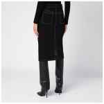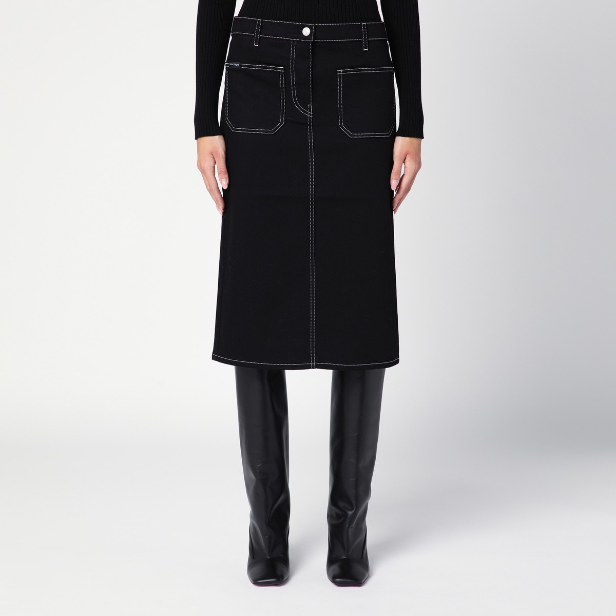 Black cotton denim skirt from Courrèges featuring front zip and button fastening, belt loops, two patch pockets on the back, two patch pockets on the front with logo patch, contrast stitching and back vent.