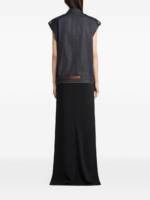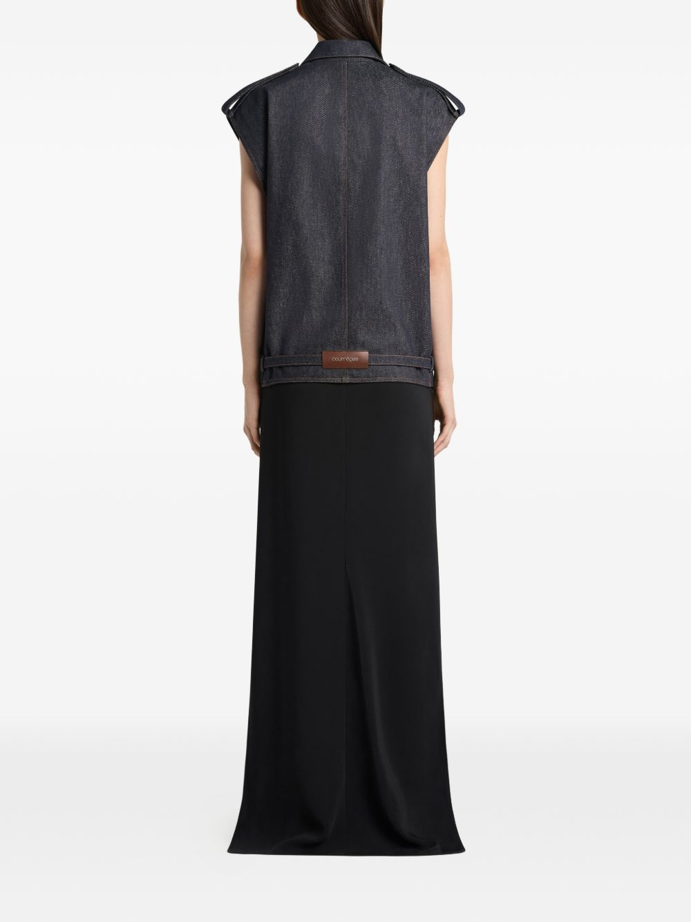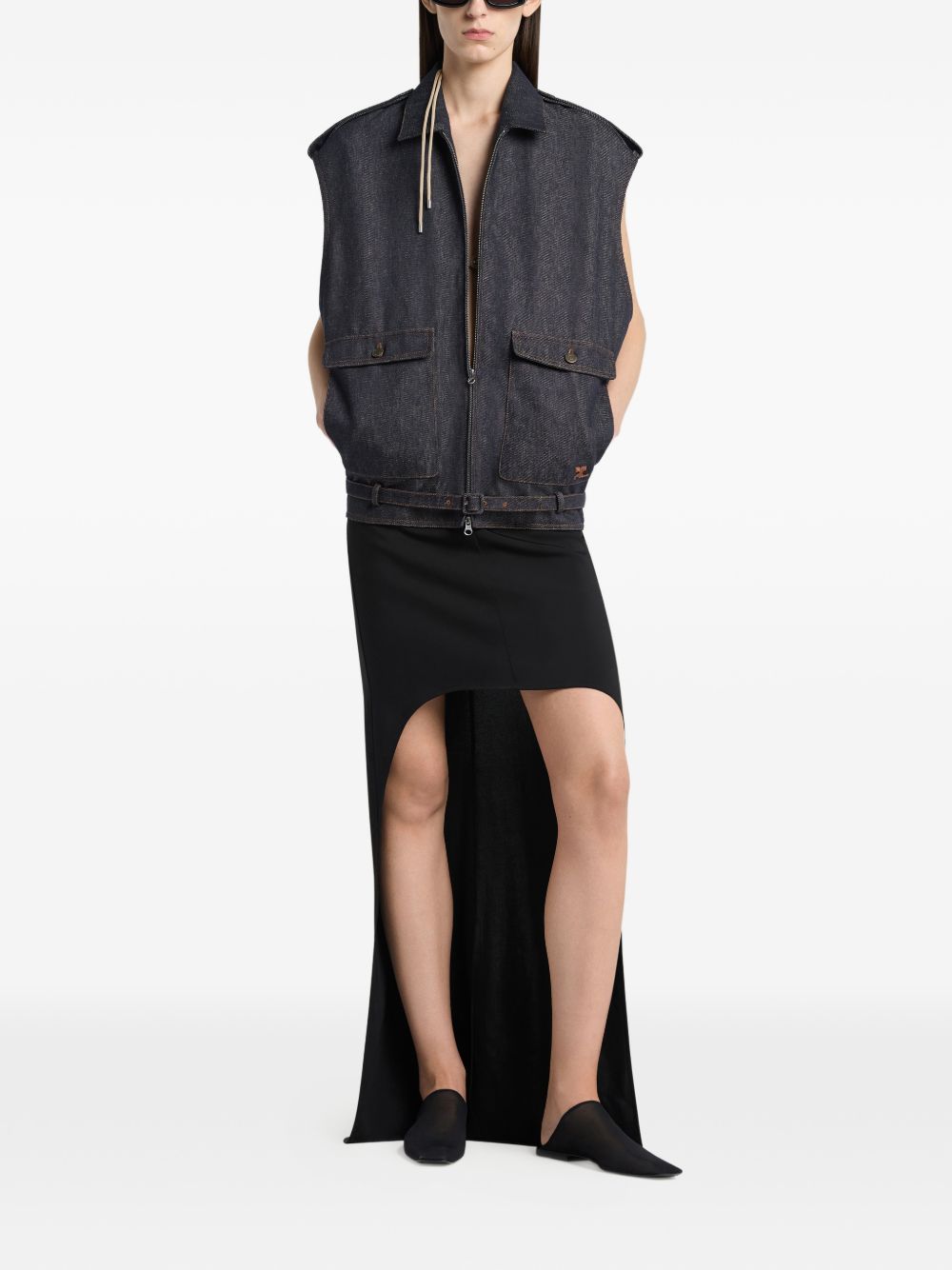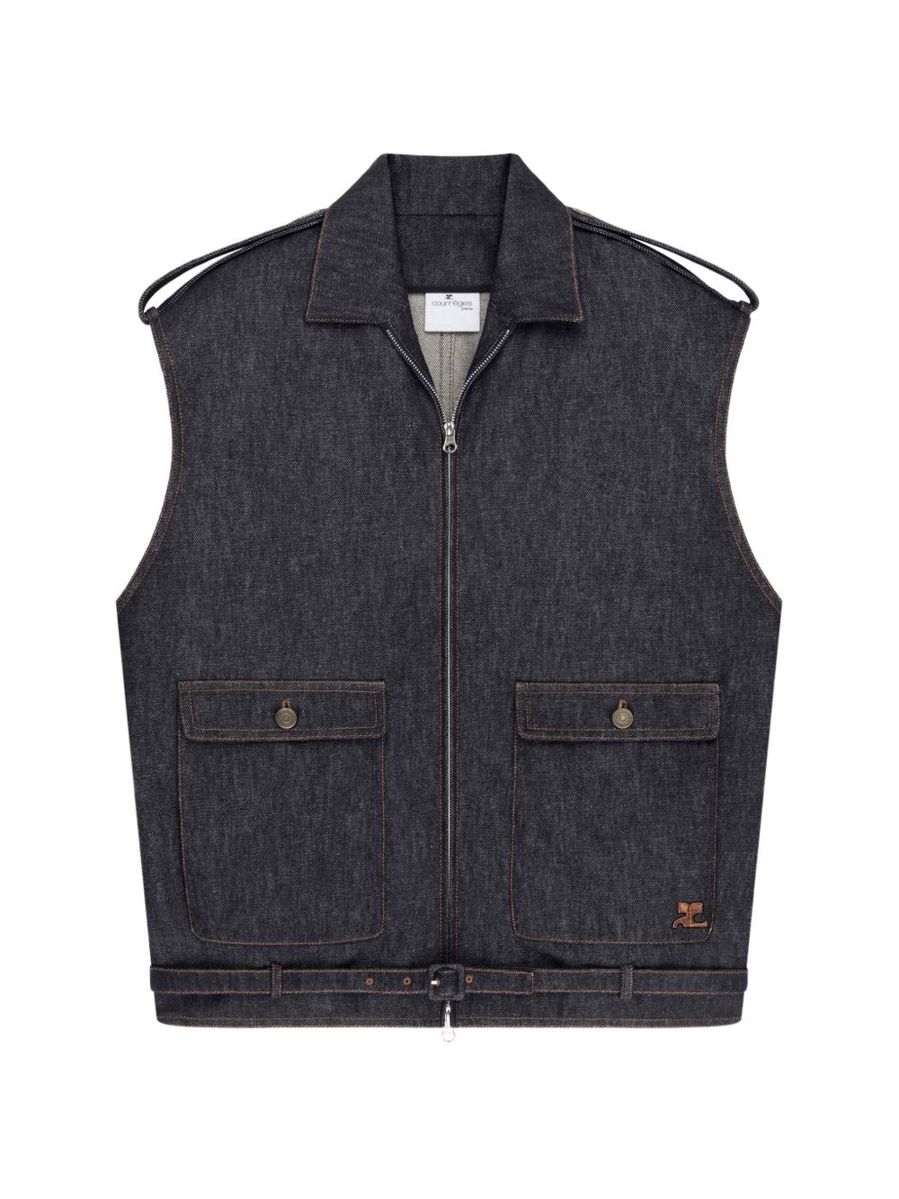 dark blue flap pockets epaulettes zip fastening Denim sleeveless bomber jacket.