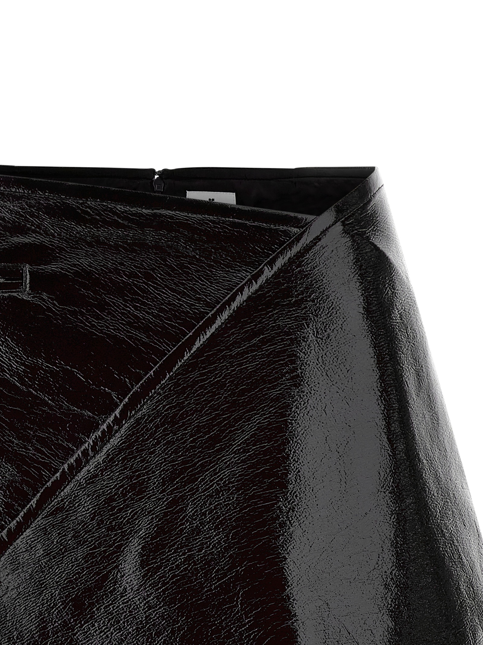 Fold Vinyl Mini’ vinyl skirt, back zip closure, pocket, asymmetrical hem with back panel running down the leg, lining.