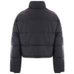 black padded design logo print to the front high neck front press-stud and zip fastening long sleeves two side slash pockets drawstring hem Nylon puffer jacket