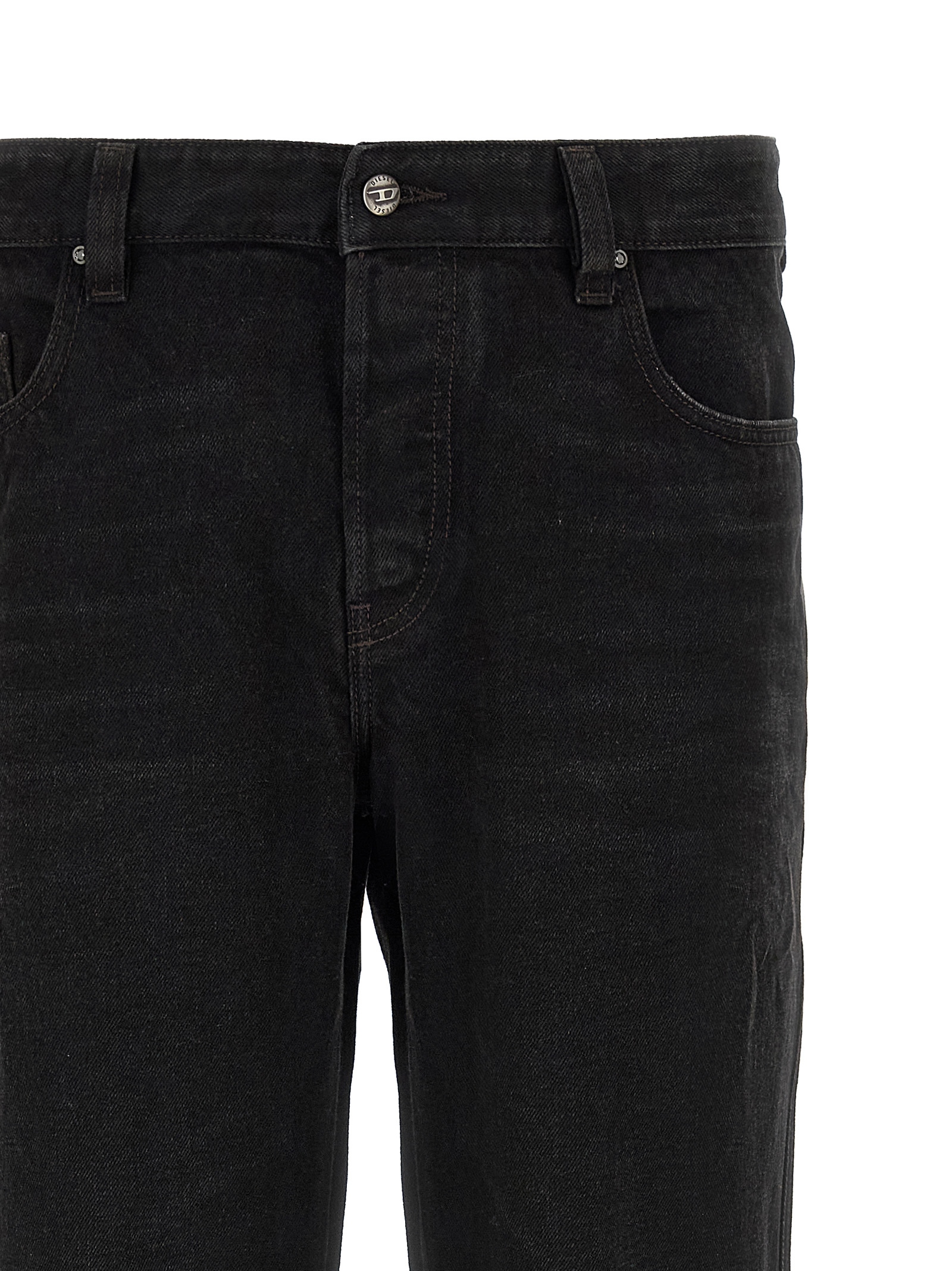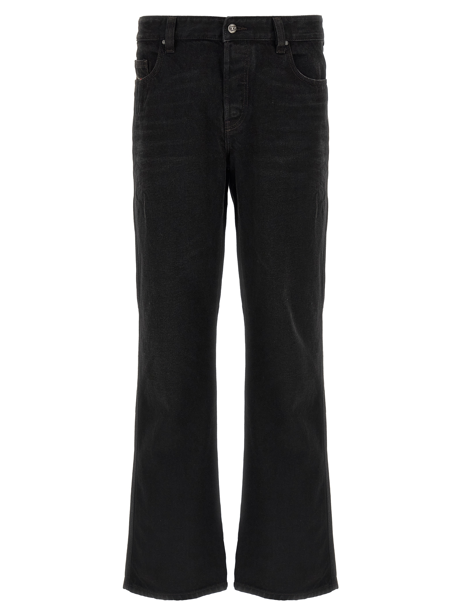 ‘1998 d-buck’ stonewashed cotton denim jeans, Swarovski rivets, Wide straight leg, Front button closure, Five pockets, Back logo tag.