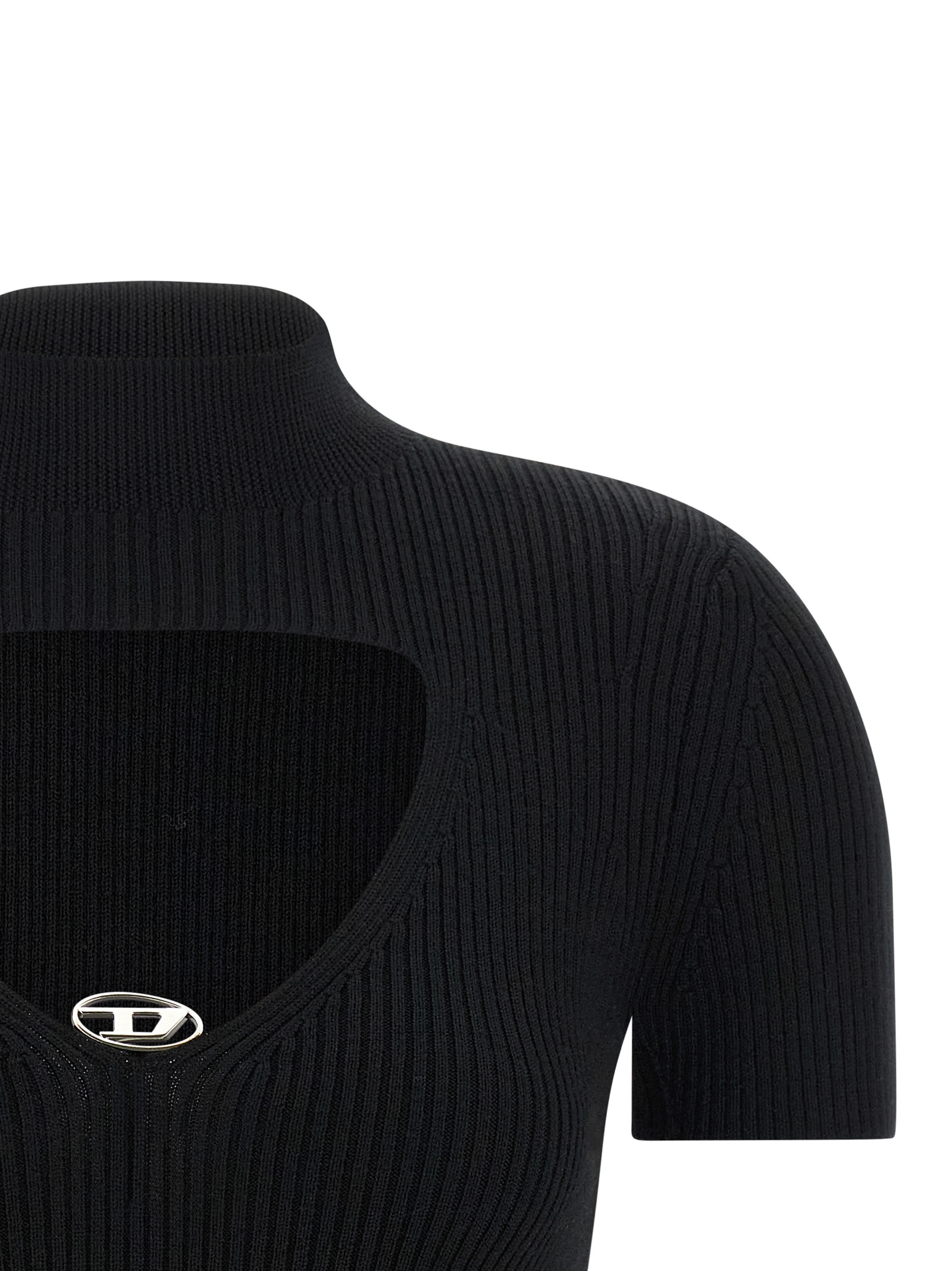 ‘M-Olive’ ribbed stretch wool top with mock collar, front cut-out with metal Oval D appliqué, short sleeves.