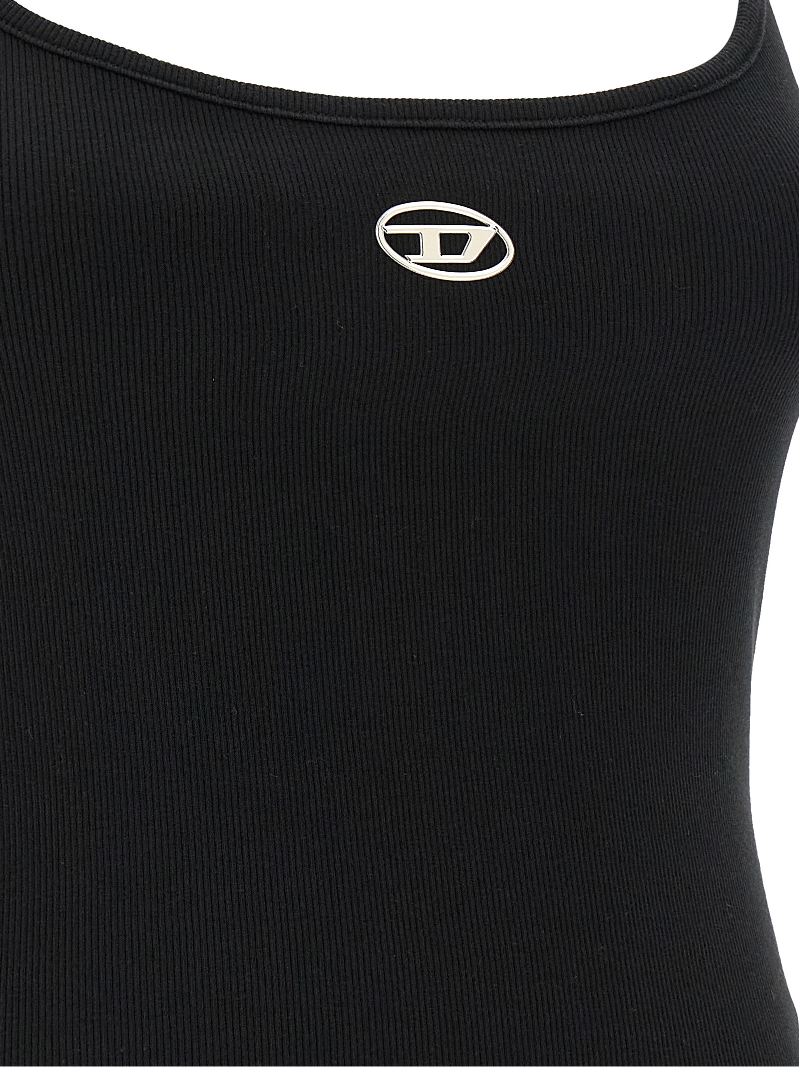 ‘T-Hupy-Od’ top in fine-ribbed stretch cotton, slightly cropped metallized ‘Oval D’ logo with embossed injection molded on the front, wide neckline at the front and back, and thin straps.