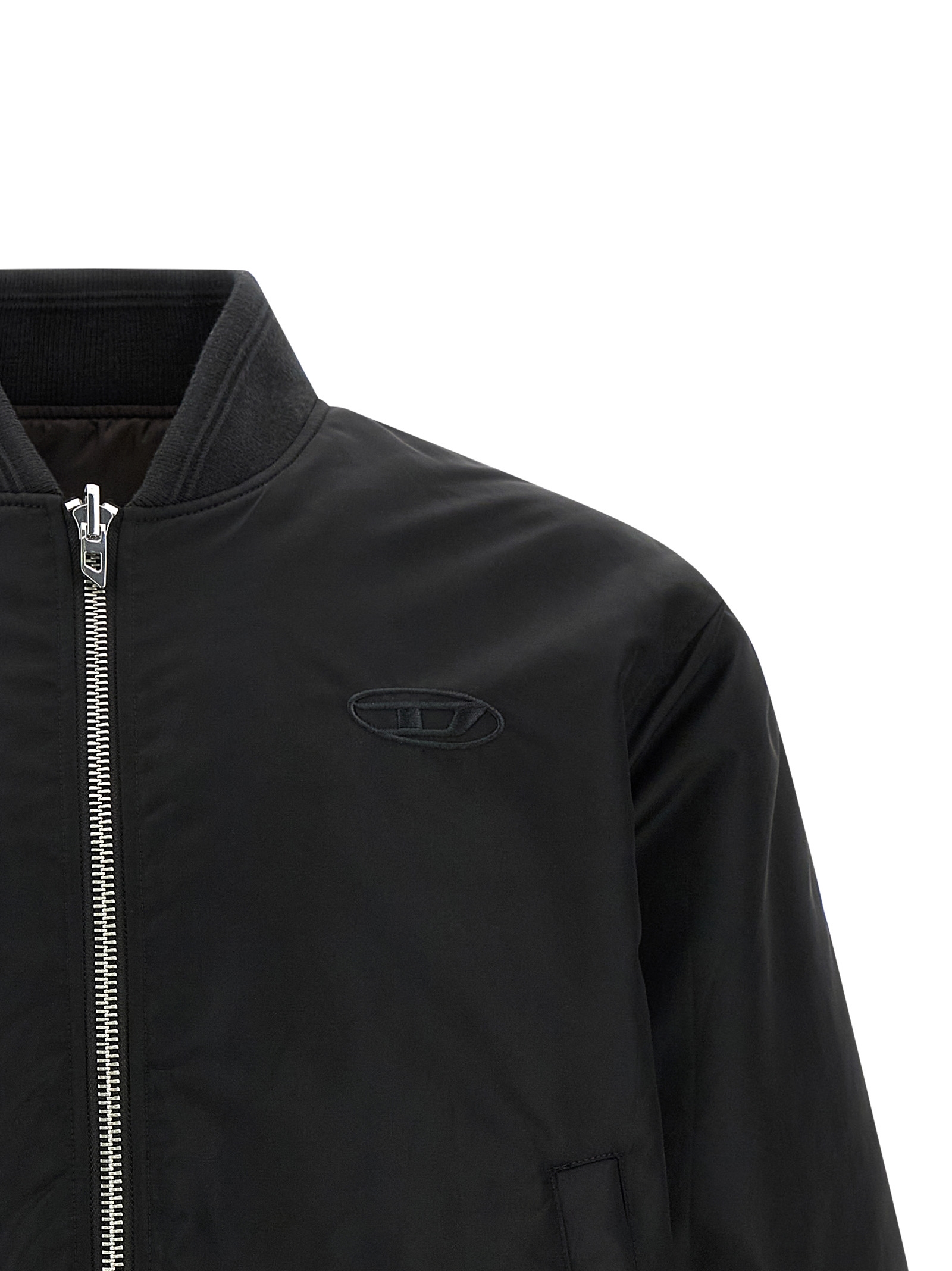 W-type-d1′ reversible bomber jacket in padded nylon satin with tone-on-tone stretch ribbed knit details, Logo patch and front zip closure, Pockets, Oversized ‘oval d’ embroidery at the back, Long cuffed sleeves, And headband.