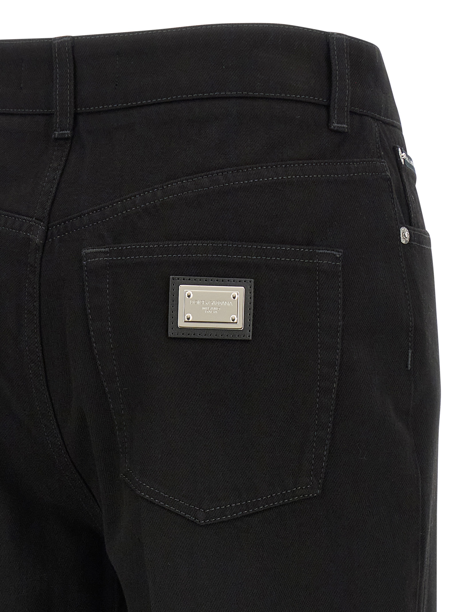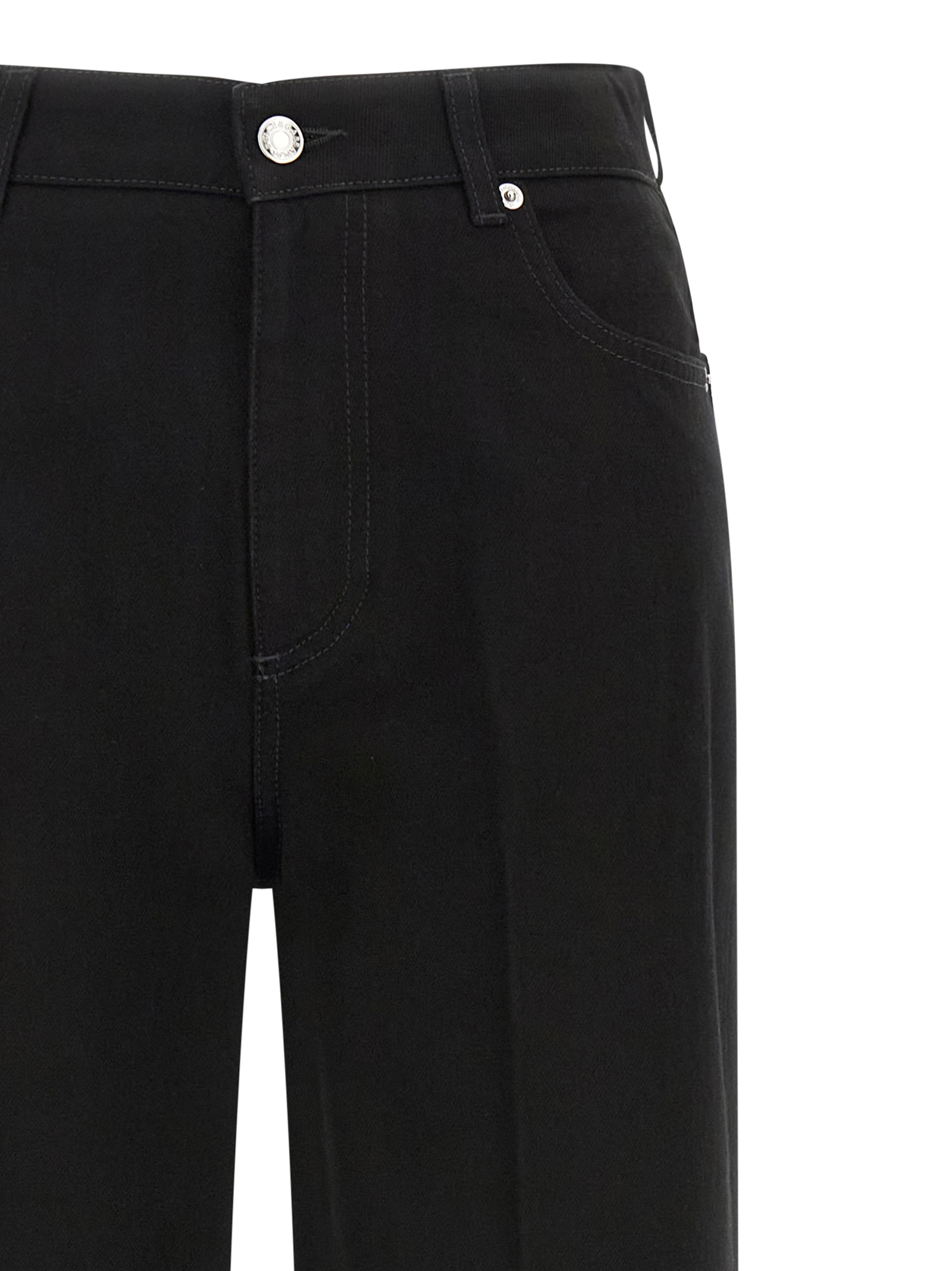 Cotton denim pants, flared leg, front stretched pleat, 5 pockets, zip and button closure, back metal plaque with logo.