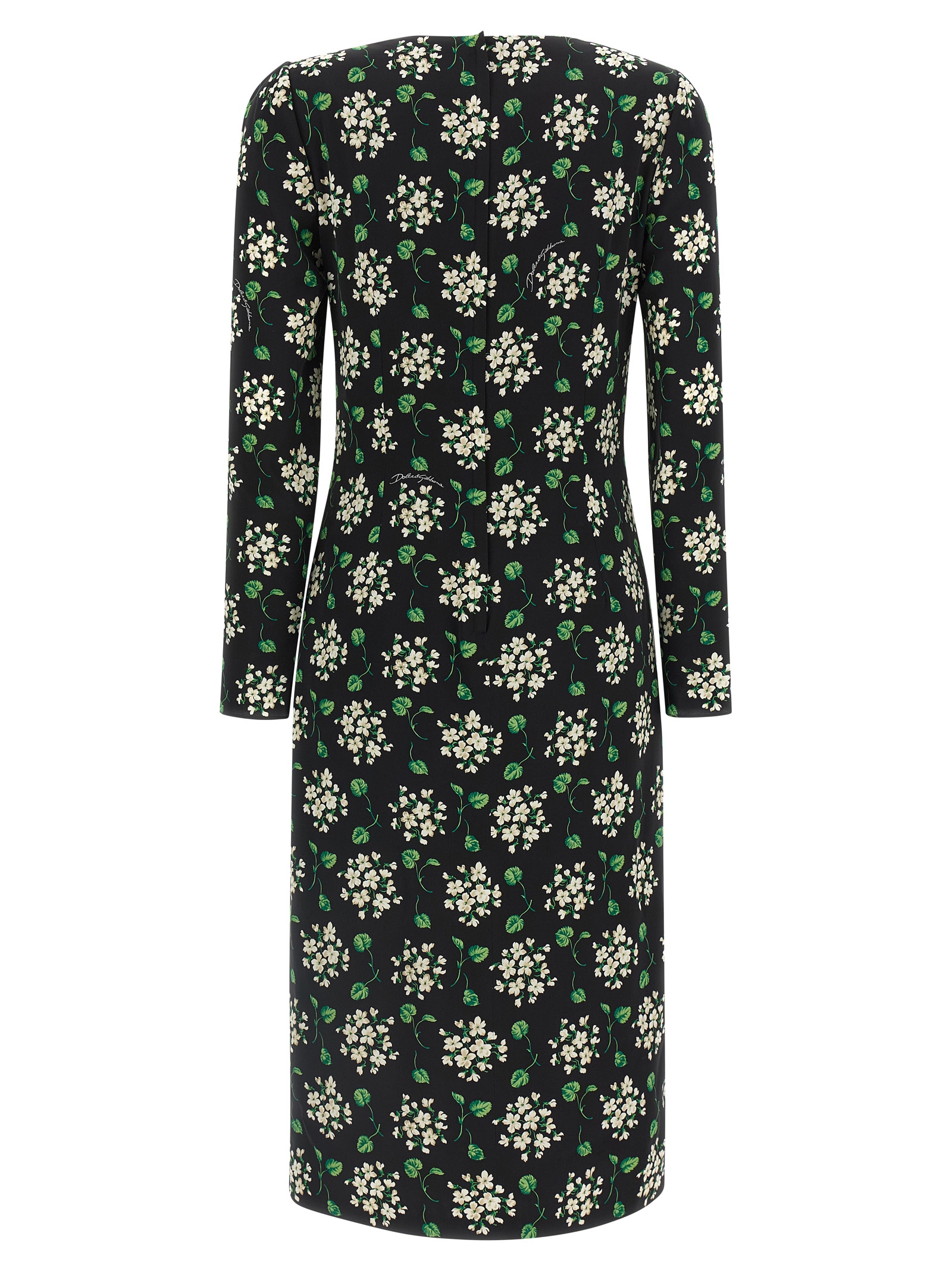 Silk charmeuse midi dress with all-over flower print, Crew neck style, Side draping with split, Back zip closure, Long sleeves.