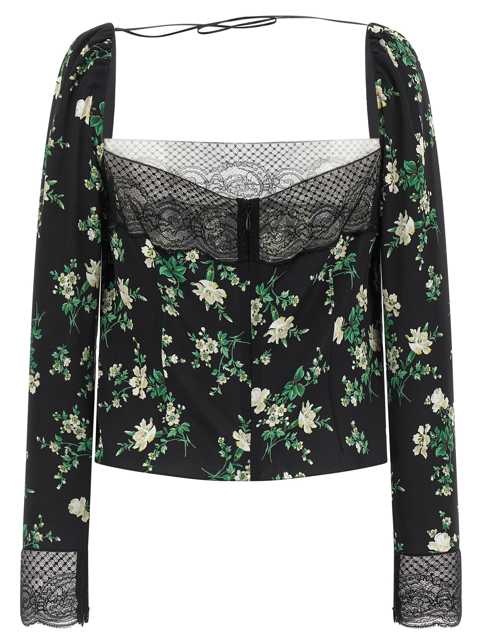Top in silk blend with all-over flower print, Deep front and back neckline with semi-transparent lace inserts, Long sleeves with lace and cuffs that can be opened with invisible zip, Back zip closure.