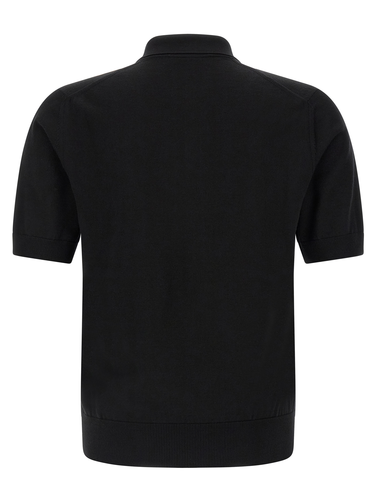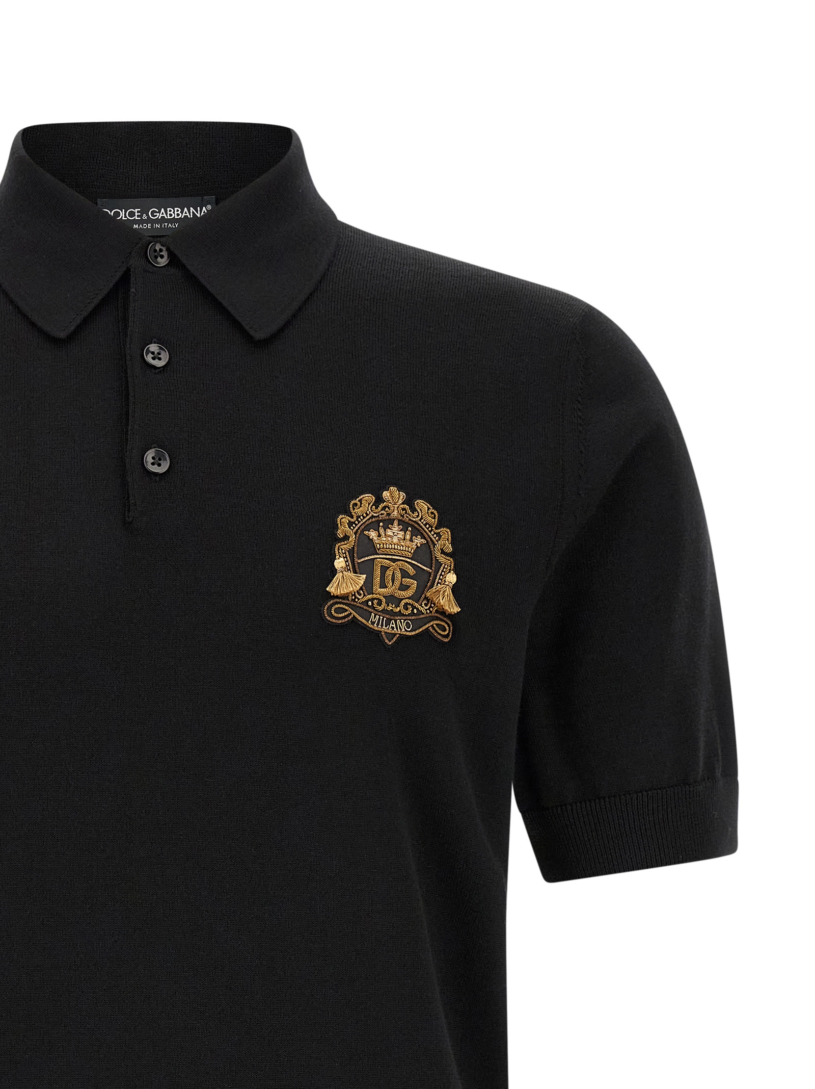 Virgin wool polo shirt with front heraldic patch, Collar and buttons, Short cuffed sleeves, And headband on the hem.