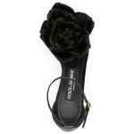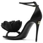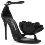 Keira floral-appliqué satin sandals from DOLCE & GABBANA featuring black, calf leather, satin finish, floral appliqué, open toe, buckle-fastening ankle strap, branded insole and high heel. Keira satin heel sandals