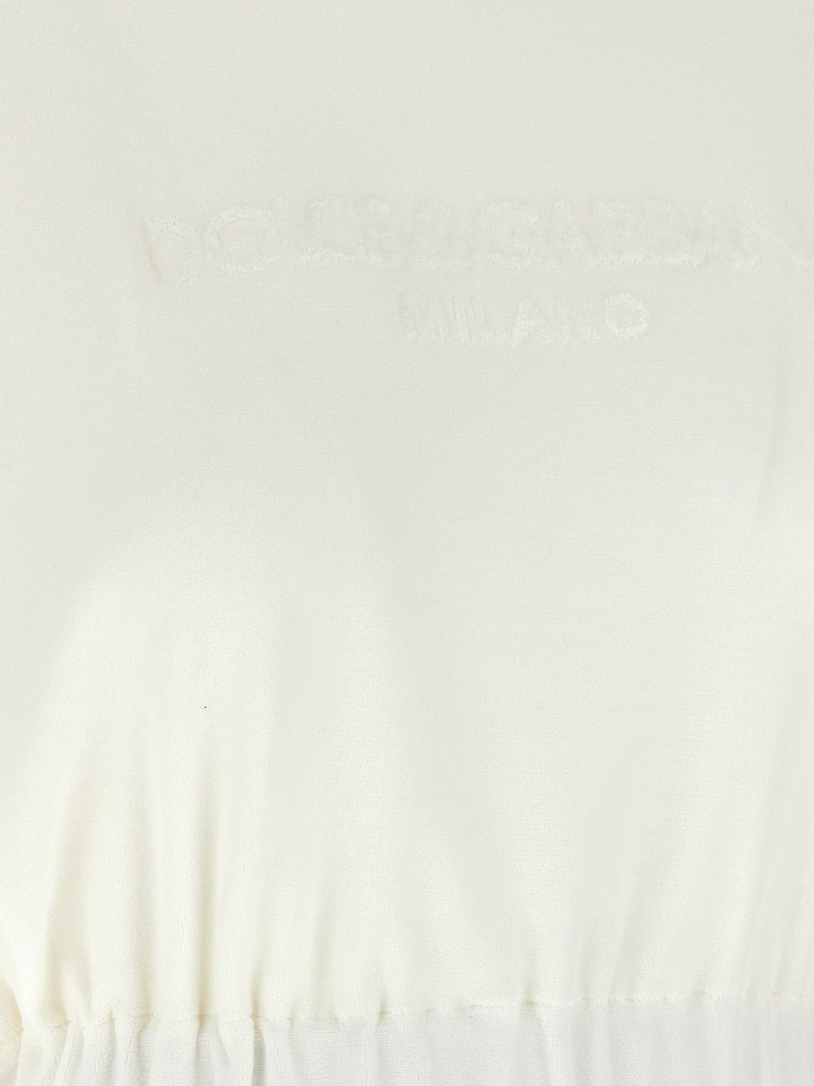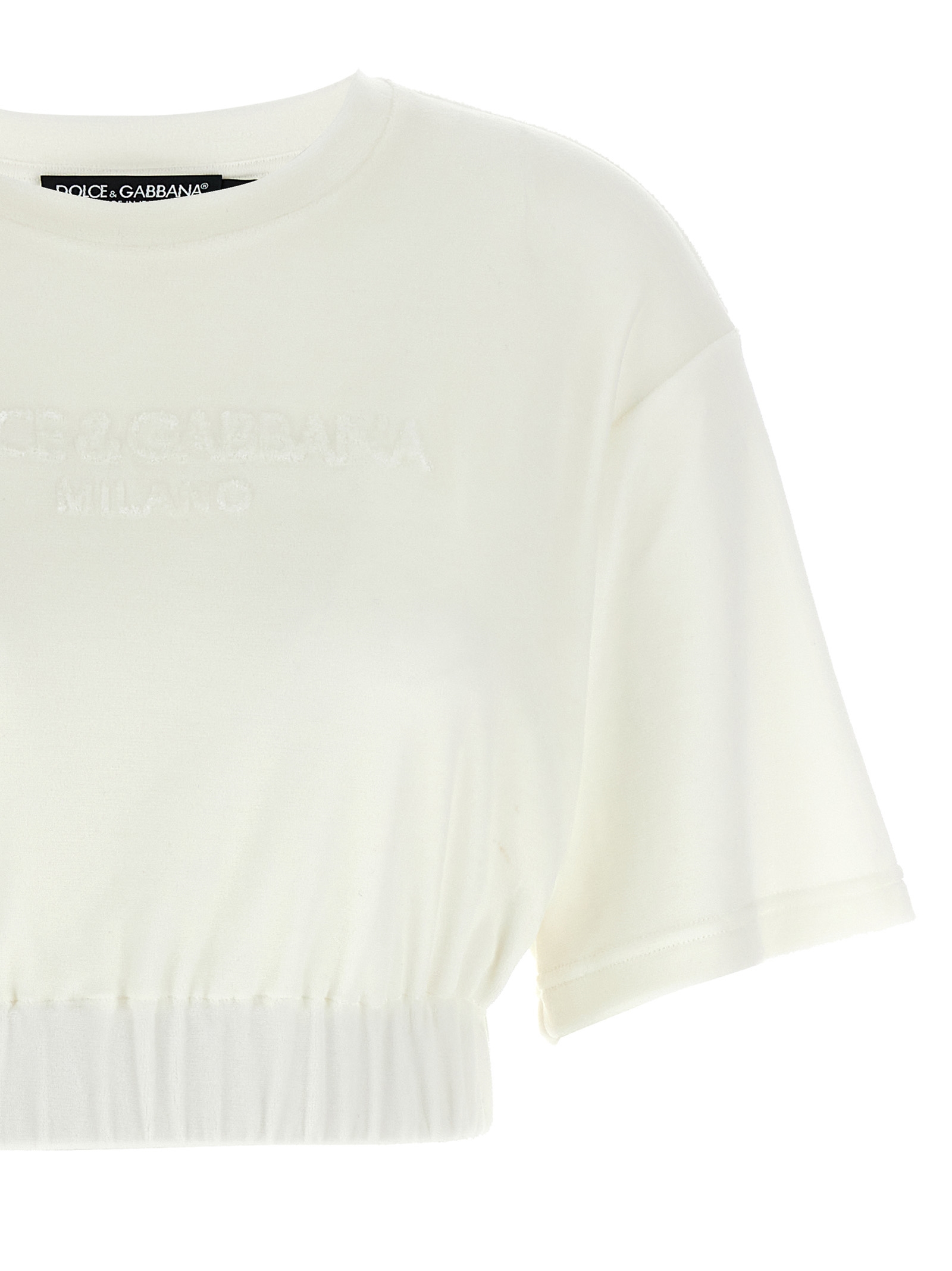 Cotton chenille top with embossed logo on the front, cropped model, crew neck, short sleeves, elastic hem.