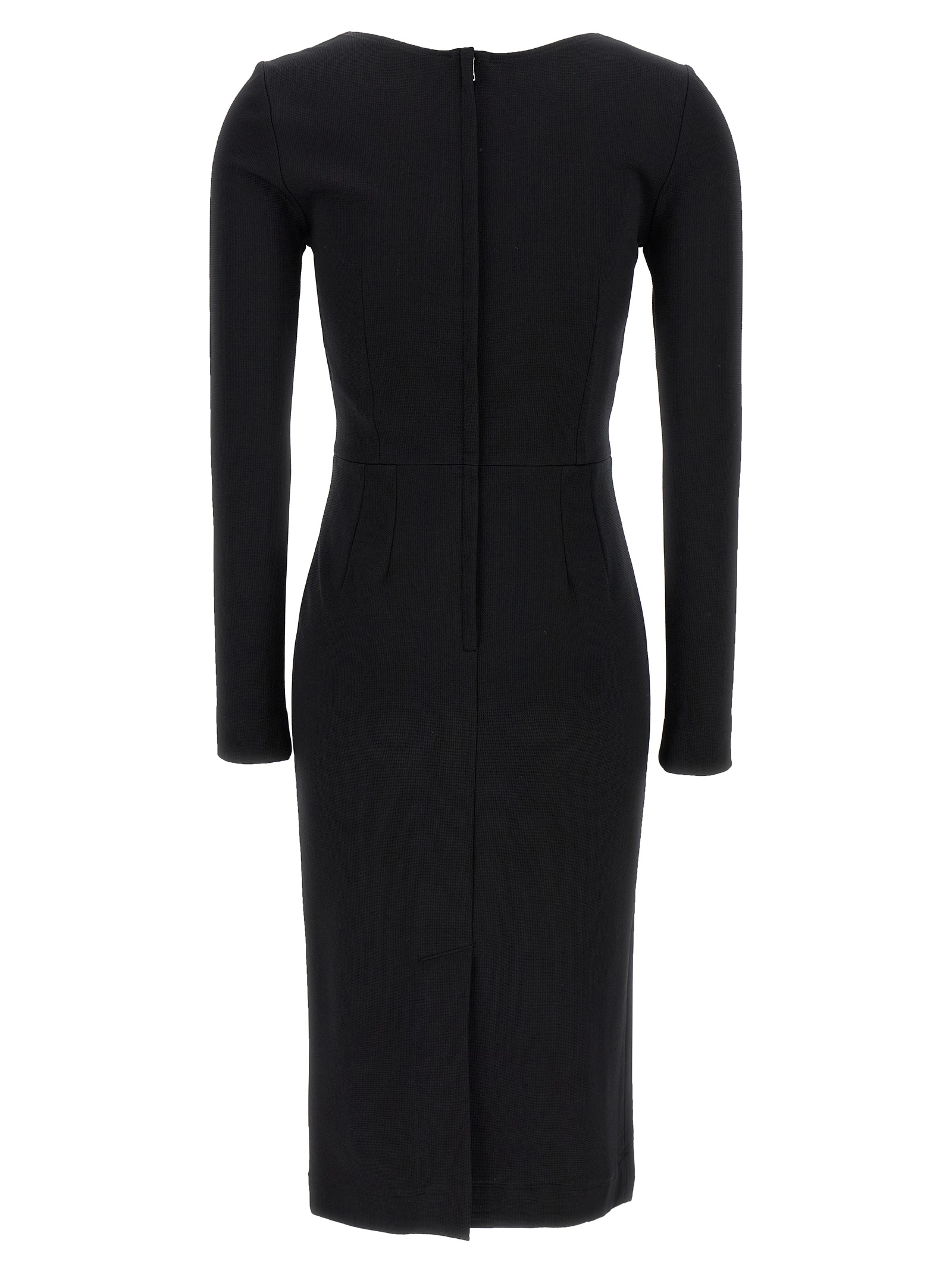 Stretch viscose midi dress with wide round neckline and metal logo detail.