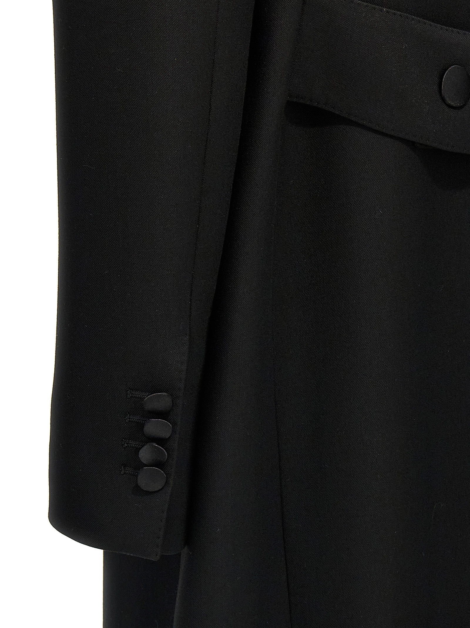 Long tuxedo coat in double wool gabardine, spear lapels, double-breasted style with button closure, long sleeves and back martingale.