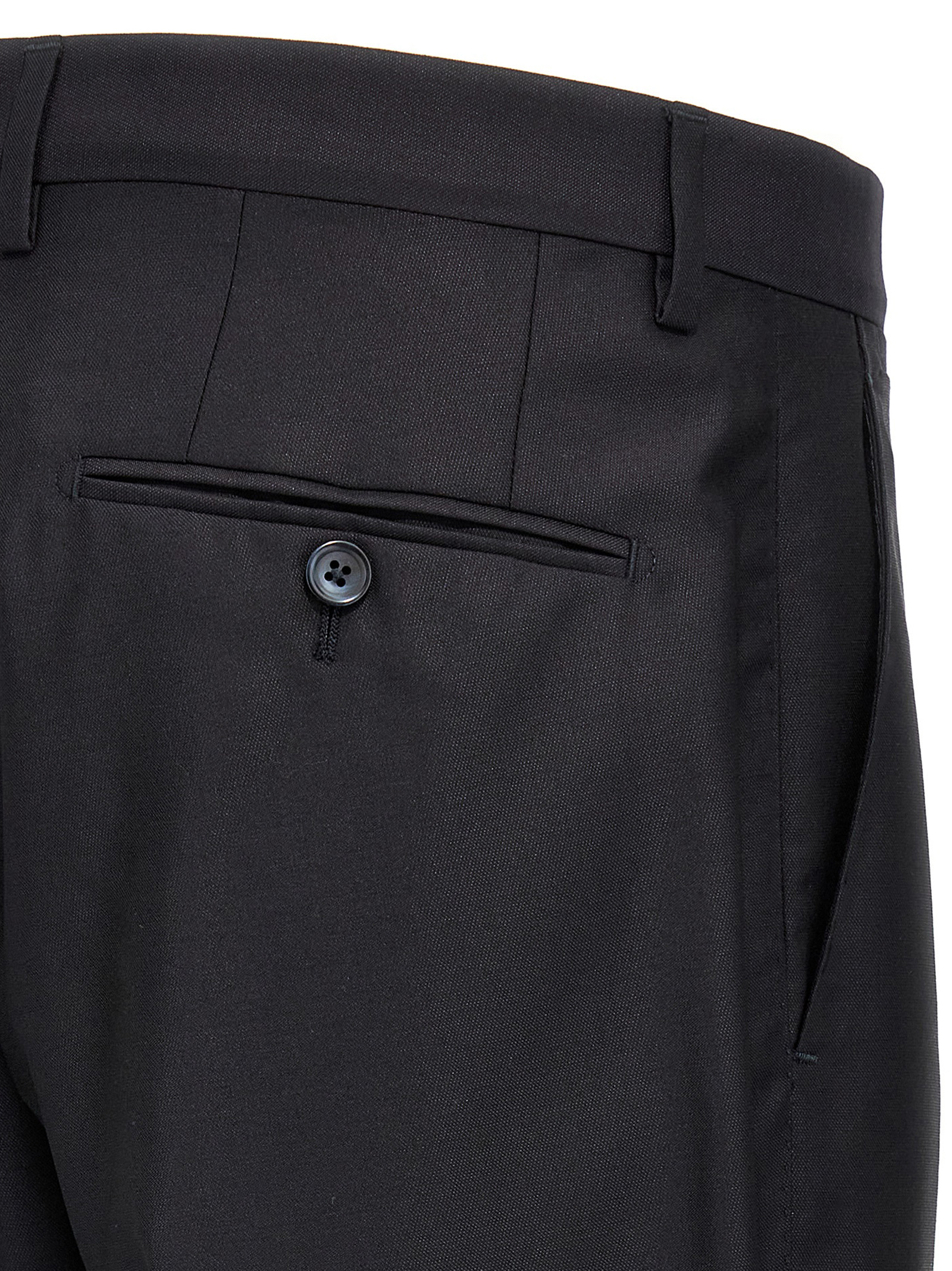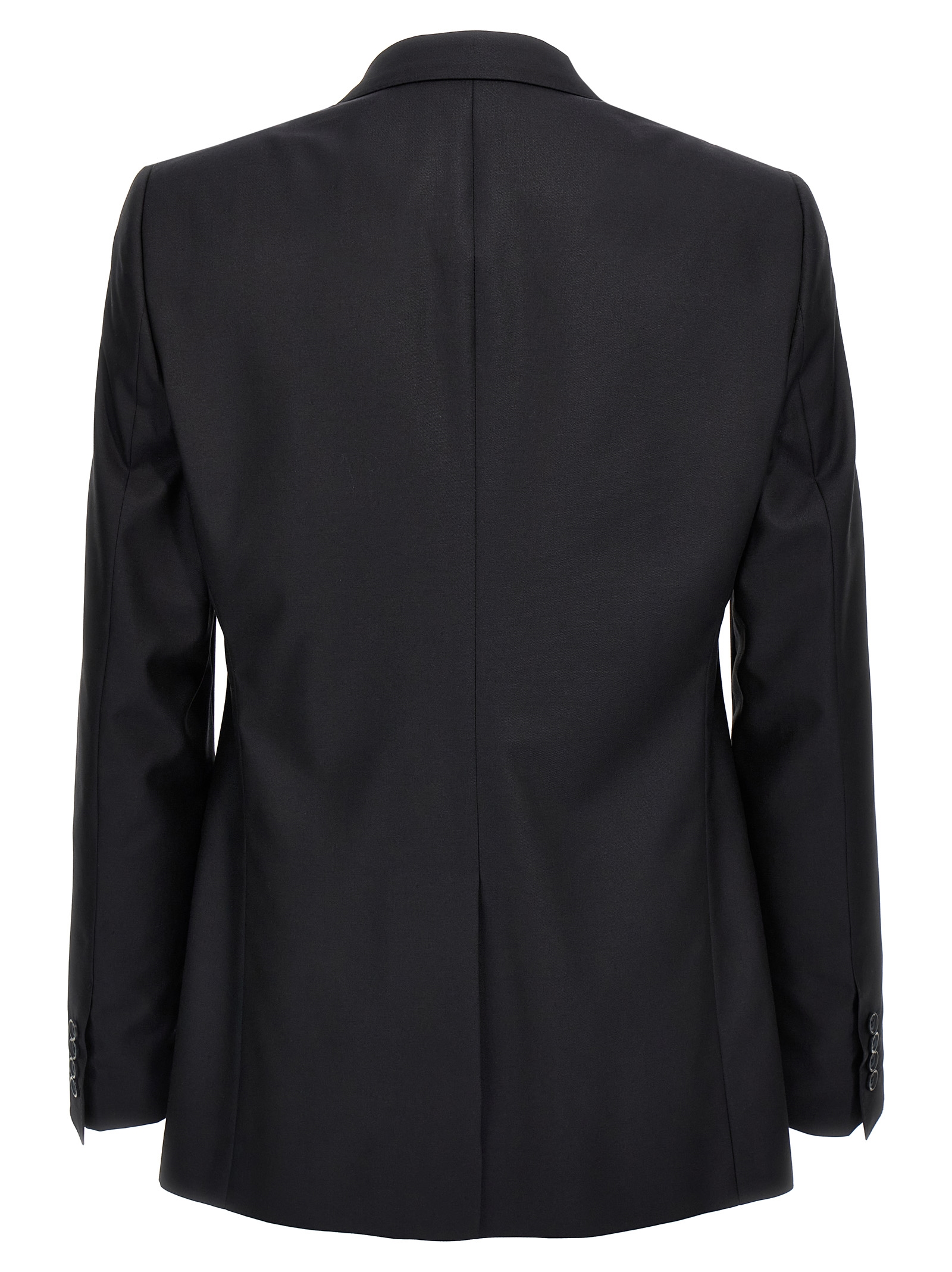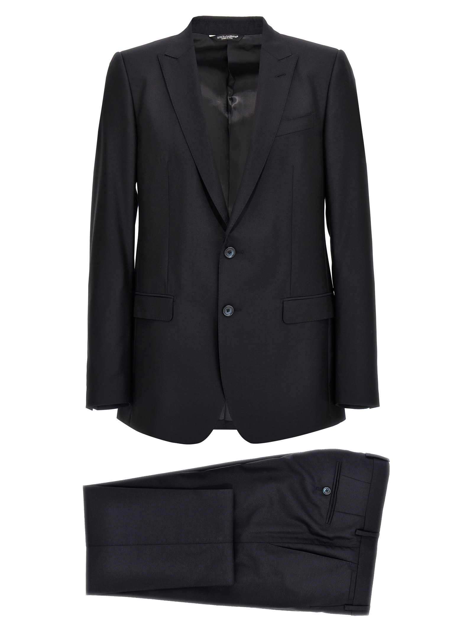 Single-breasted “Martini” suit in wool and silk canvas. Jacket with peaked lapels, flap pockets and chest pocket, button fastening, central back vent, long sleeves with padded shoulder. Straight-leg trousers with front slanted pockets and back welt pockets with button, closure with zip, button and hook.