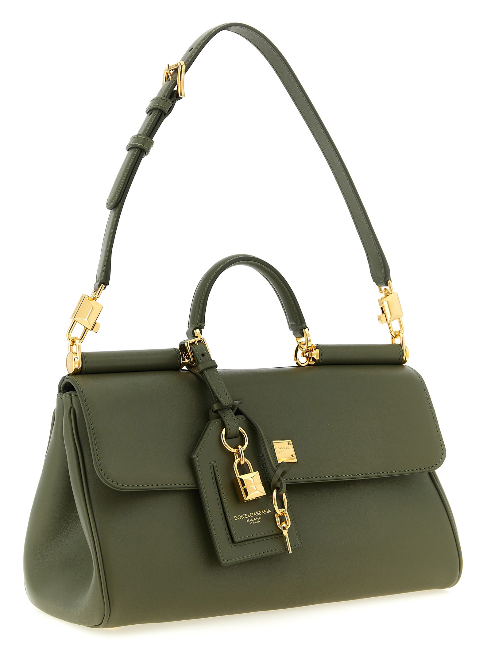 ‘My Sicily’ medium handbag in plongé calf leather, vintage brass galvanic metal details, flap closure with tuck-in mechanism and monogalvanic metal plate with front engraved logo, fixed handle, rigid bottom with metal feet, back pocket with zip and embossed logo, adjustable and removable shoulder strap, name tag with key and removable metal padlock.