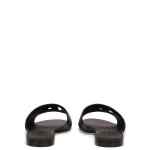 Black calf leather DG Millennials logo slides from DOLCE & GABBANA featuring embossed logo to the front, cut-out detailing, almond toe, branded insole and flat rubber sole. This piece fits small – take one size up. DG Logo leather flat sandals