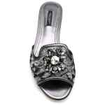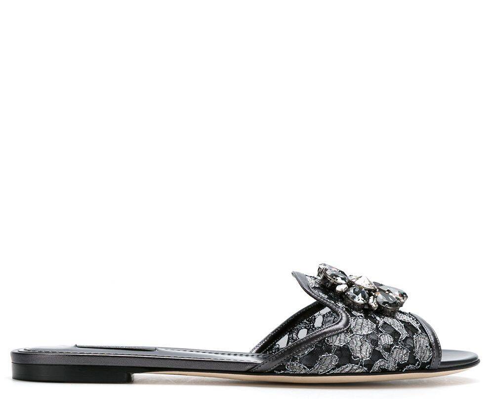Dark silver Bianca crystal-embellished lace sandals from Dolce & Gabbana featuring a floral lace pattern, crystal embellishments, an open toe, a branded insole and a slip-on style. Rainbow flat lace sandals