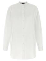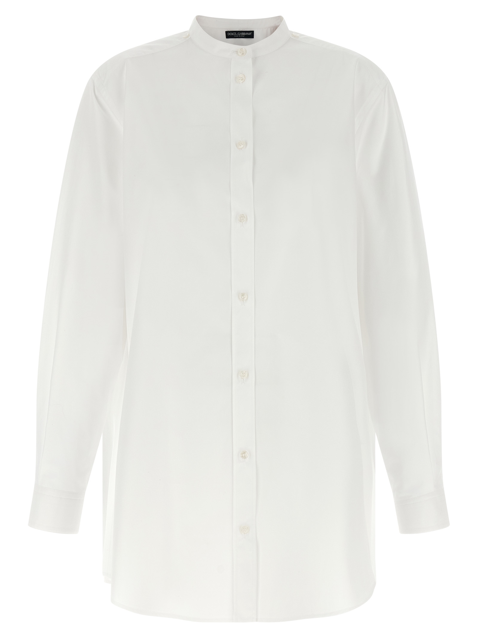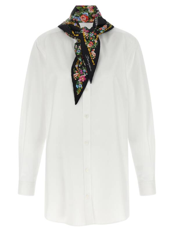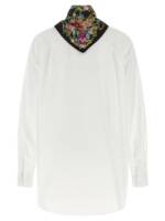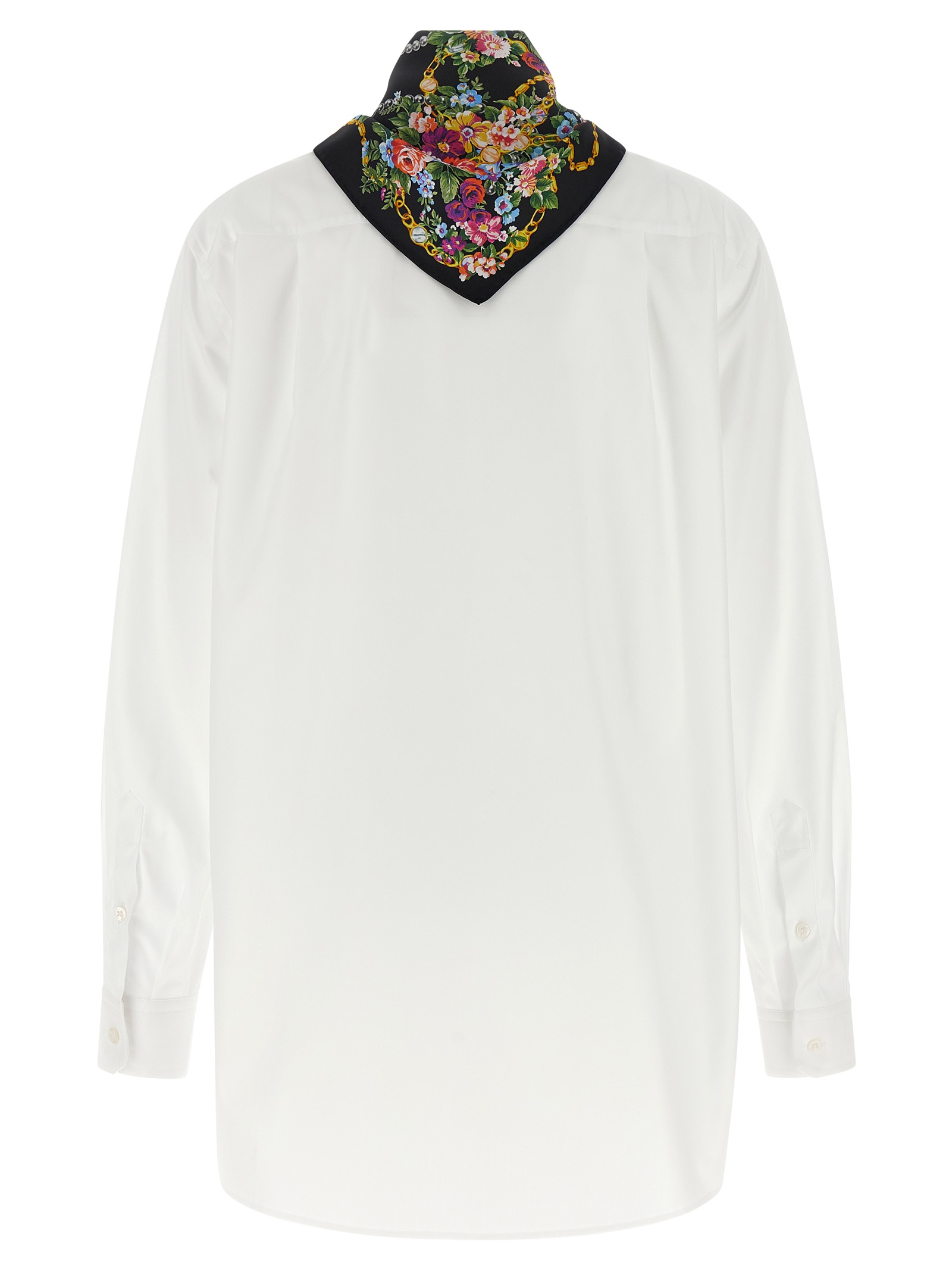 Cotton poplin shirt, Mandarin collar, Front mother-of-pearl button closure, Long cuffed sleeves, Patterned triangle silk scarf fixed on the neckline with buttons and removable. Size and Fit – true to size fit