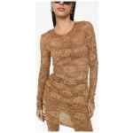 light brown stretch-silk Chantilly lace semi-sheer construction round neck concealed rear zip fastening long sleeves straight hem above-knee length Floral lace dress