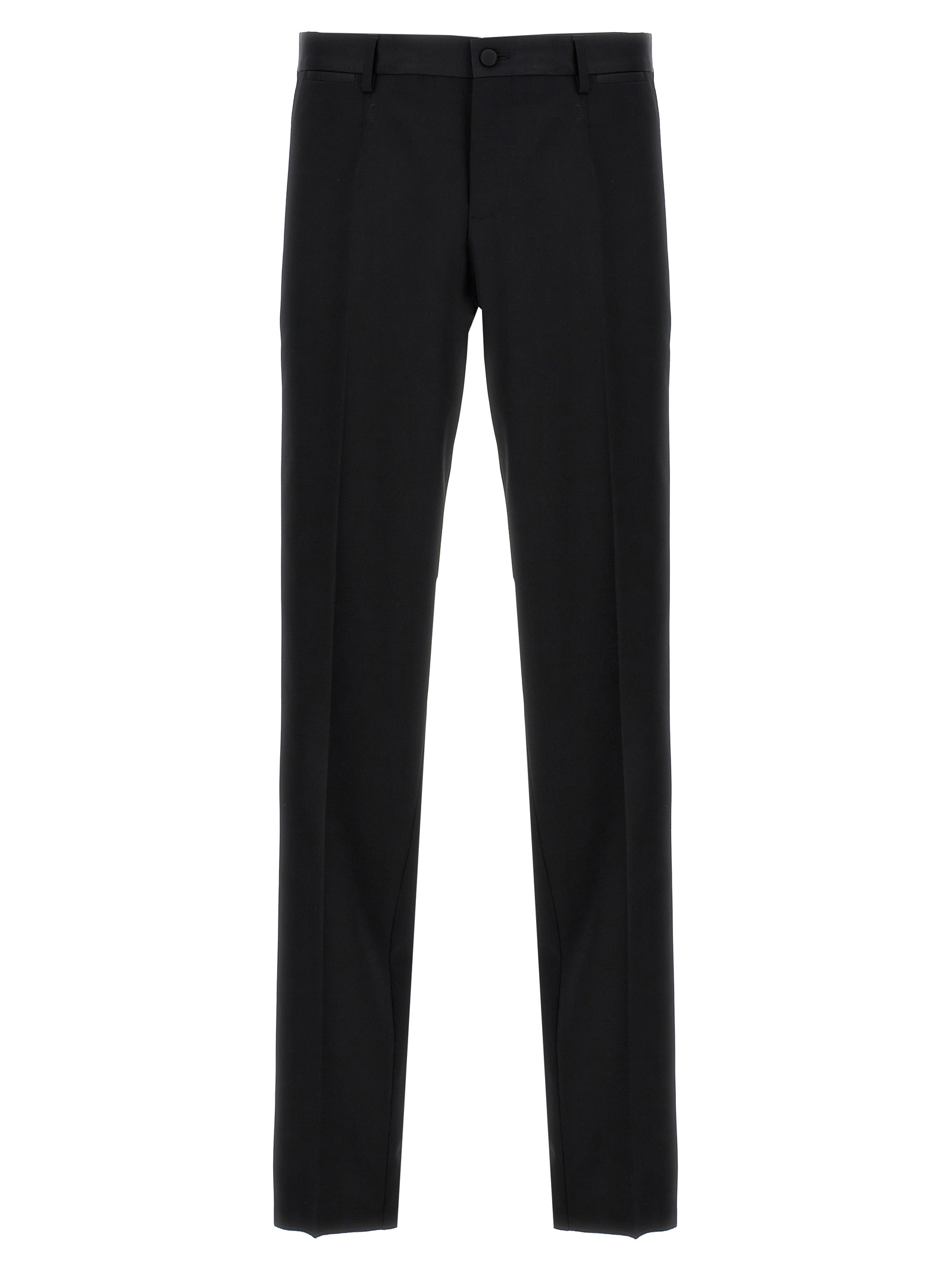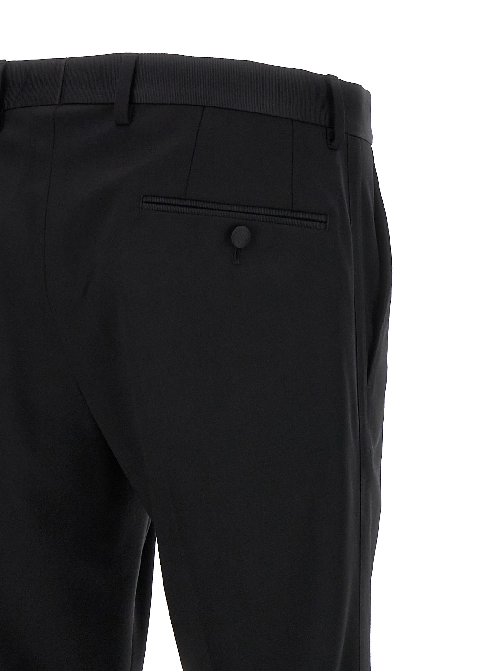 Tailored trousers in slightly stretch wool, side bands, pockets, front zip and hook closure.