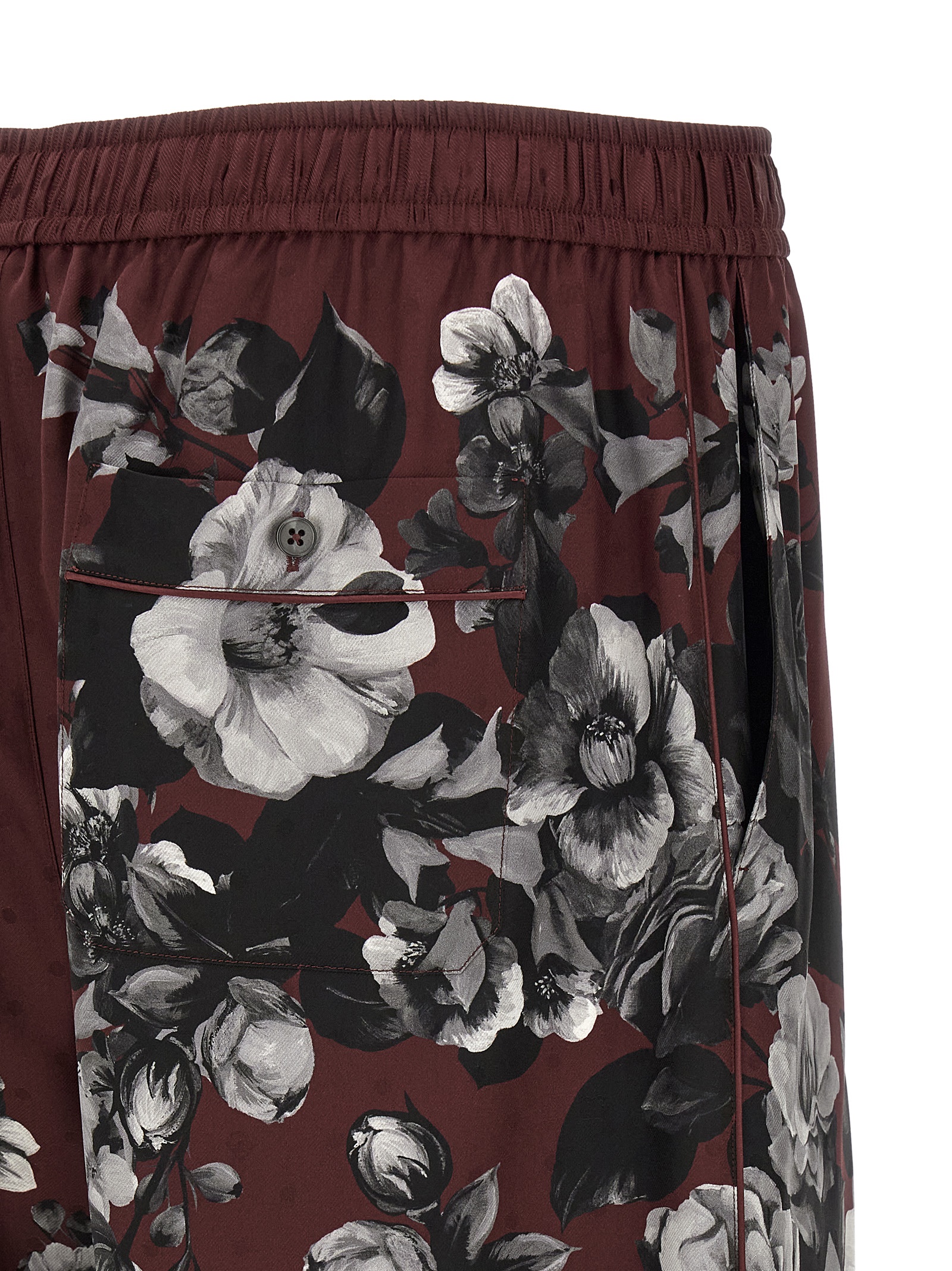 ‘vanity’ bermuda shorts in all-over ‘ramage peonie’ print silk twill, Flared wide leg, Drawstring elastic waistband, Trompe l’oeil flap, Pockets.