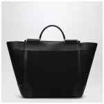 Dolce & Gabbana black fabric and leather tote bag, featuring an adjustable and removable leather shoulder strap, two top handles, front logo print, snap closure, and an internal zip pocket.