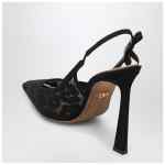 Dolce & Gabbana black lace slingback décolleté with rhinestone application, characterized by pointed design, elasticized strap at the back, side closure with DG buckle, high heel, and leather sole.