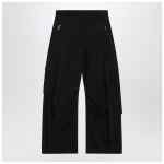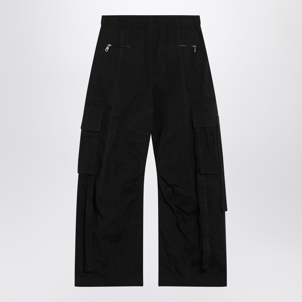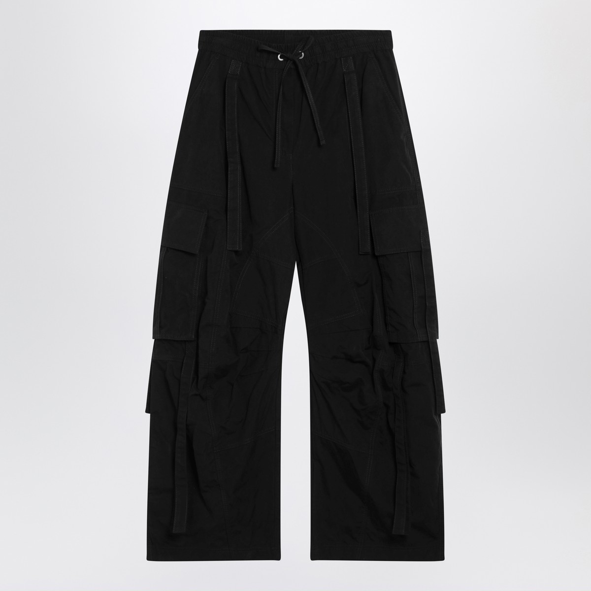 Dolce & Gabbana cargo trousers in black waxed cotton fabric featuring a low waist, front slanted pockets with vertical cuts, back zip pockets with vertical cuts, pleated flap cargo pockets on the sides, elasticated waistband with drawstring, and a washed, crinkled look.