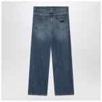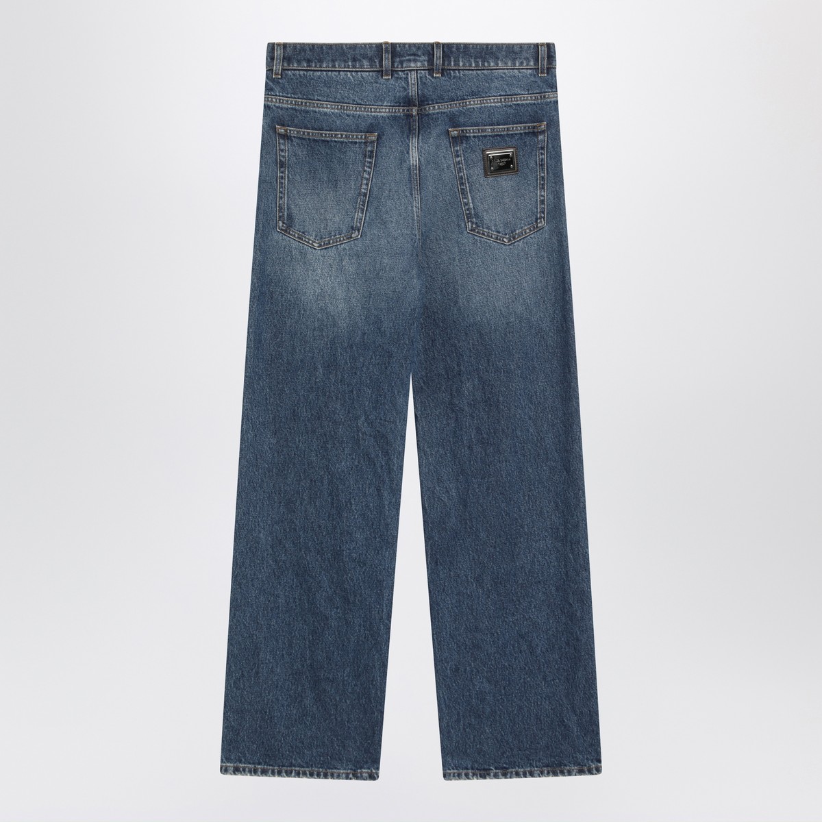 Dolce & Gabbana blue washed-effect cotton denim jeans, featuring front zip and button closure, belt loops, small lettering logo patch on the front, five classic pockets, branded metal tag on the back, front pleats and oversized fit.
