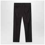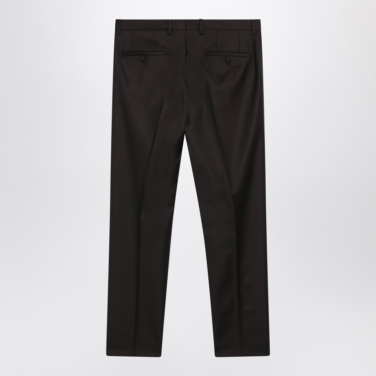 Ebony brown virgin wool trousers by Dolce & Gabbana featuring a front zip and button fastening, belt loops, two side pockets, pressed front crease and two rear buttoned pockets.