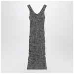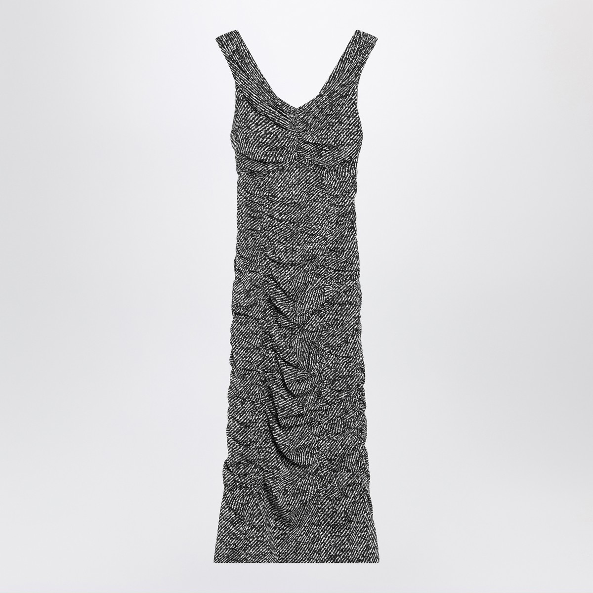 Midi dress by Dolce & Gabbana in silk blend with black and white diagonal print, featuring a fitted draped design, off-the-shoulder style, and a zip closure at the back.
