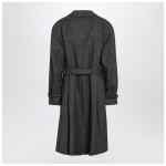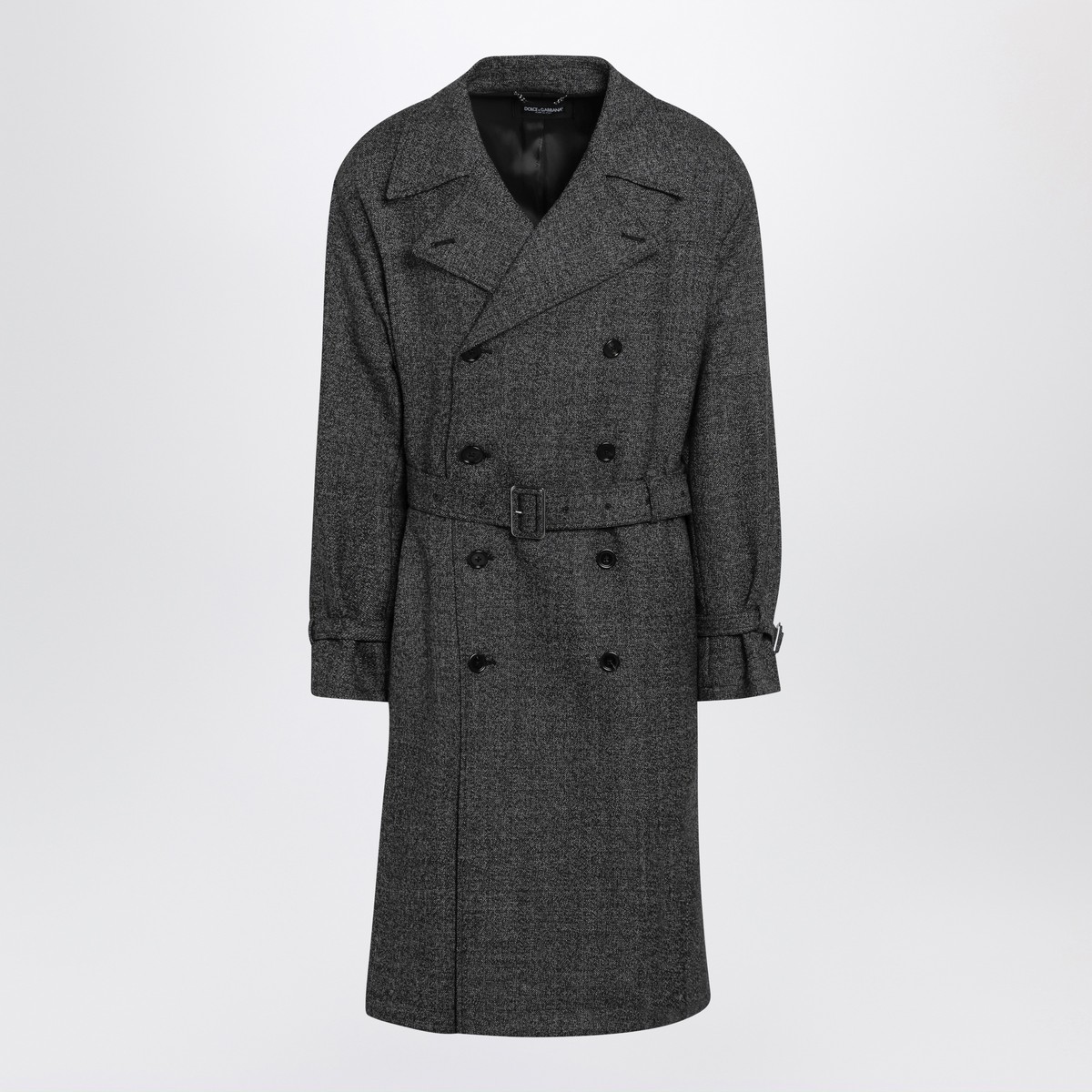 Coat by Dolce & Gabbana in grey virgin wool blend, featuring adjustable waist belt, front button fastening, long sleeves with adjustable wrist straps, and two side welt pockets.