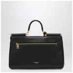 Black calfskin handbag by Dolce & Gabbana, featuring an adjustable and removable shoulder strap, top handle, tuck-in closure, brass galvanic tag with logo, removable leather keychain with logo, zippered back pocket, and internal zippered pocket.