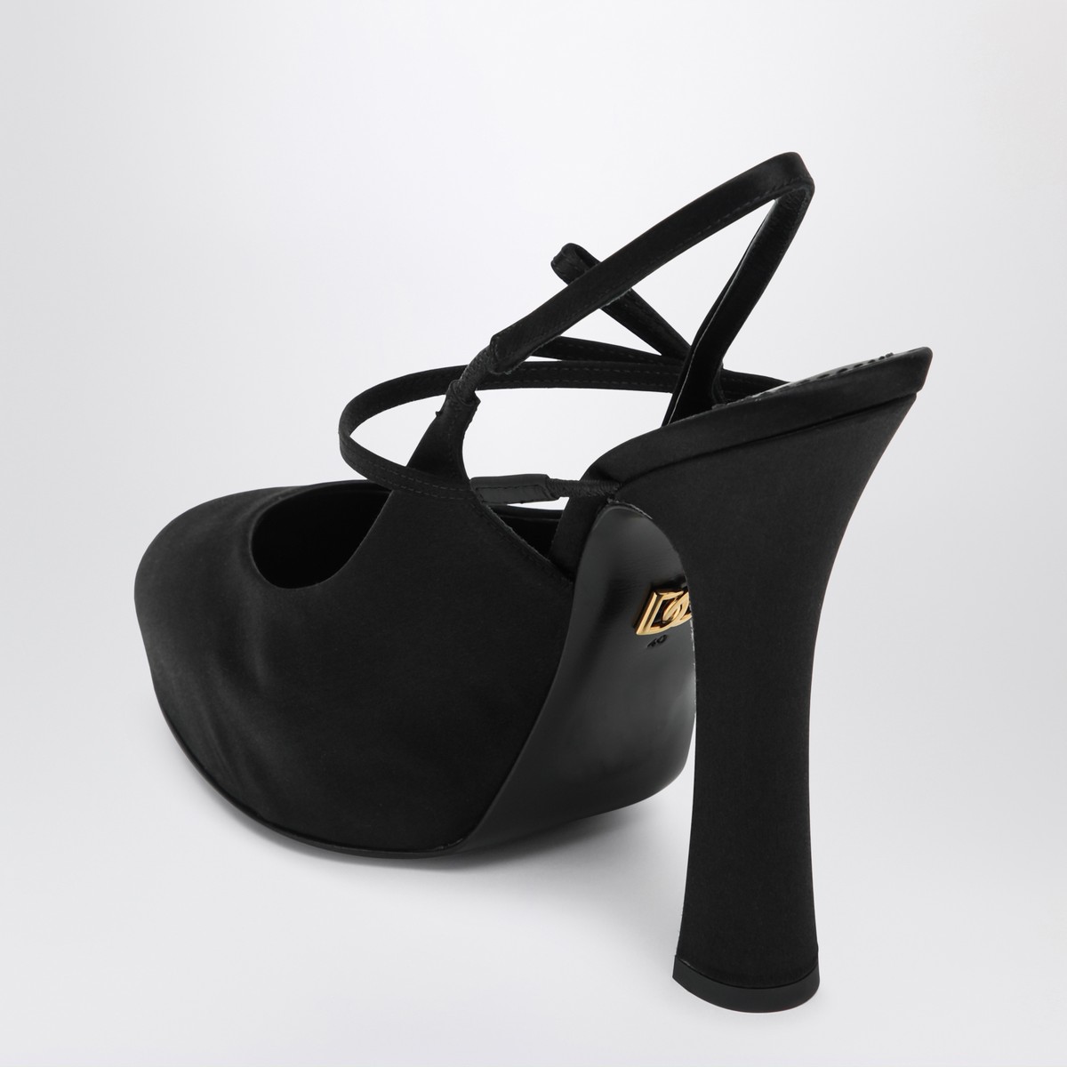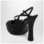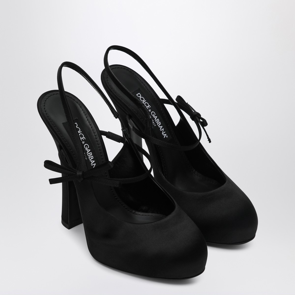 Slingback by Dolce & Gabbana in black satin, characterized by a round toe, crossed and elasticized straps with a bow detail, platform, thick high heel, and leather sole.