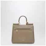 Shoulder bag by Dolce & Gabbana in taupe calf leather, featuring an adjustable and removable shoulder strap, top handle, tuck-in closure, brass galvanic tag with logo, removable leather keychain with logo, zippered back pocket, and internal zippered pocket.