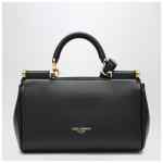 Small handbag by Dolce & Gabbana in black grained leather, featuring a front flap with logo plate, handle, adjustable and removable shoulder strap, one internal zip pocket, one internal mobile pocket, printed fabric lining, metal feet and gold-tone hardware.