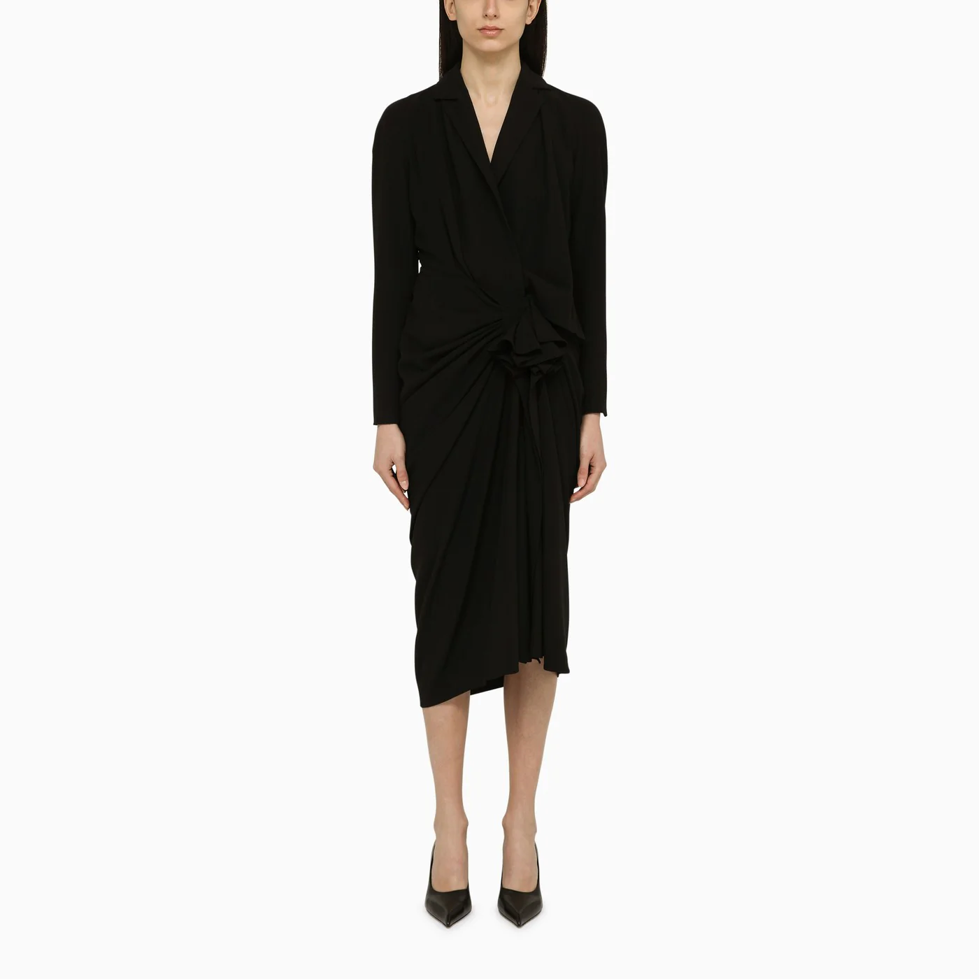 Black wool-blend midi dress from Dries Van Noten featuring long sleeves with slit a V-neck a cut-out back and a draped detail on the front.