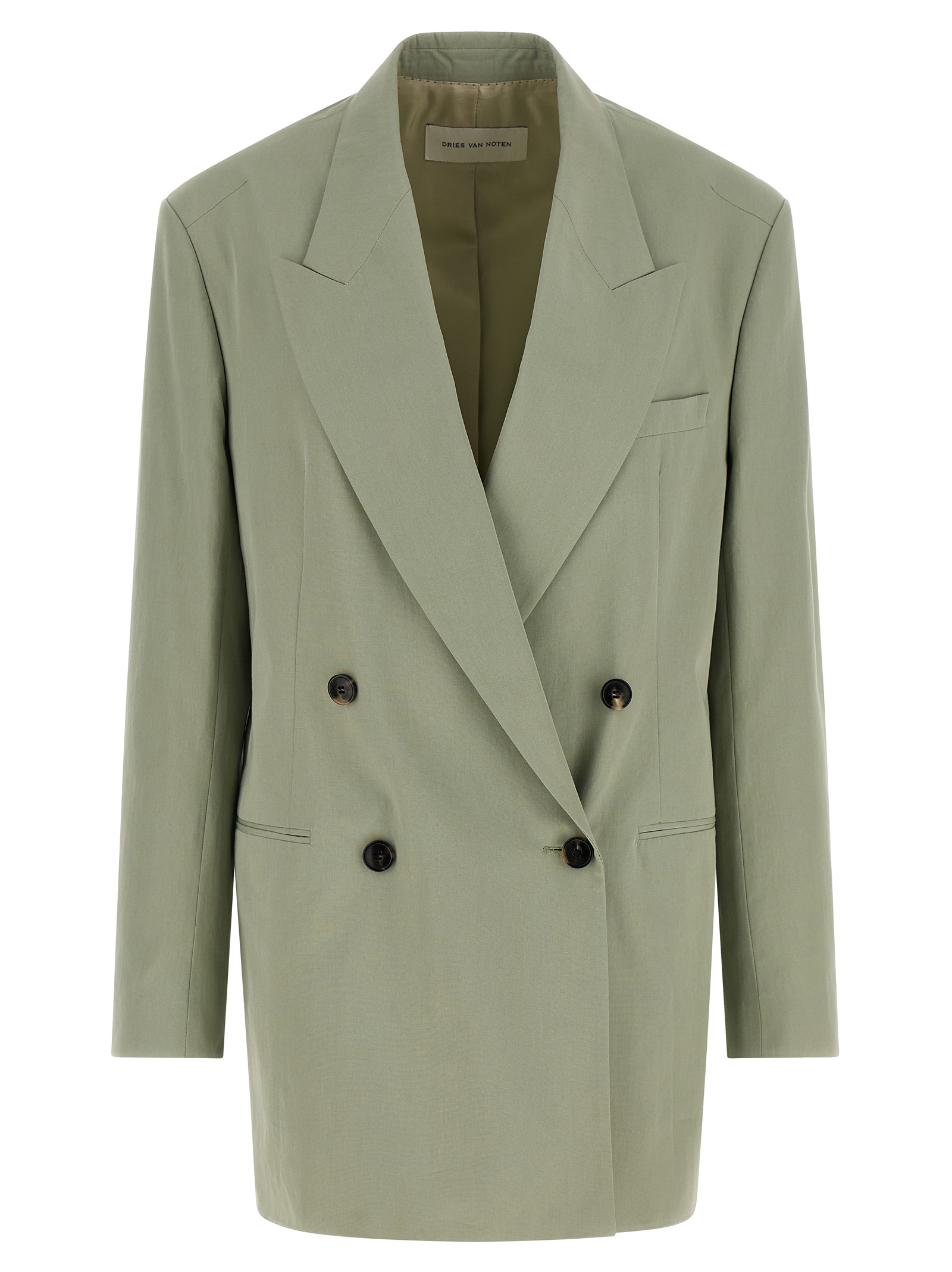 ‘Bliss’ double-breasted cotton blazer with front horn button closure, peak lapels, breast pocket, patch pockets, structured shoulder strap, long sleeves, viscose lining.