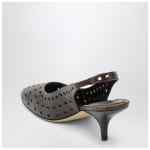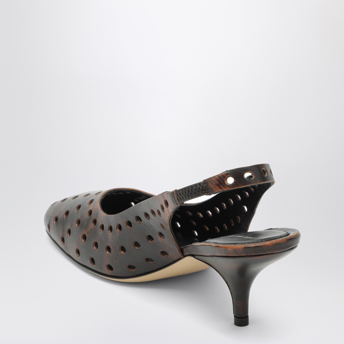Dries Van Noten brown aged-effect leather slingbacks, featuring a perforated design, kitten heels, elasticated straps, and leather sole.