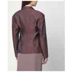 Dries Van Noten jacket in a burgundy striped viscose blend, featuring padded shoulders, long sleeves, a wide notched lapel, a welt pocket on the chest, and two flap pockets on the front.