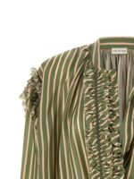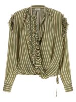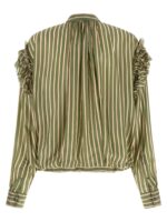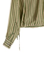 ‘cenever bis’ cupro shirt with striped pattern ruffles on the front and sleeves, Wide crossed v-neck on the front, Ruffles on the back, Long sleeves with cuffs, Drawstring on the hem.