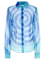 ‘cloudy’ semi-transparent washed silk muslin shirt with all-over print, Pointed collar, Front mother-of-pearl button closure, Long cuffed sleeves, Rounded and asymmetrical hem. Size and Fit – True to size fit