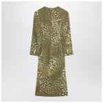 Dries Van Noten dress in viscose with khaki print, featuring a V-neck, long sleeves with buttoned cuffs, an adjustable waist belt, and a front slit.