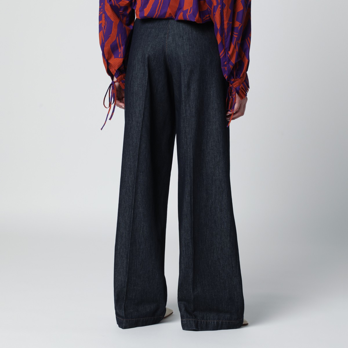 Trousers by Dries Van Noten in indigo blue cotton denim, featuring wide legs, an adjustable waistband, a high waist with belt loops, a front fastening, two side pockets and pleats at the front.